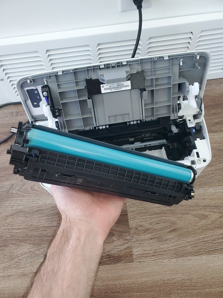 Includes the original toner cartridge plus the power cord. FYI: this printer is only compatible with HP branded toner cartridges, generic ones will not work
