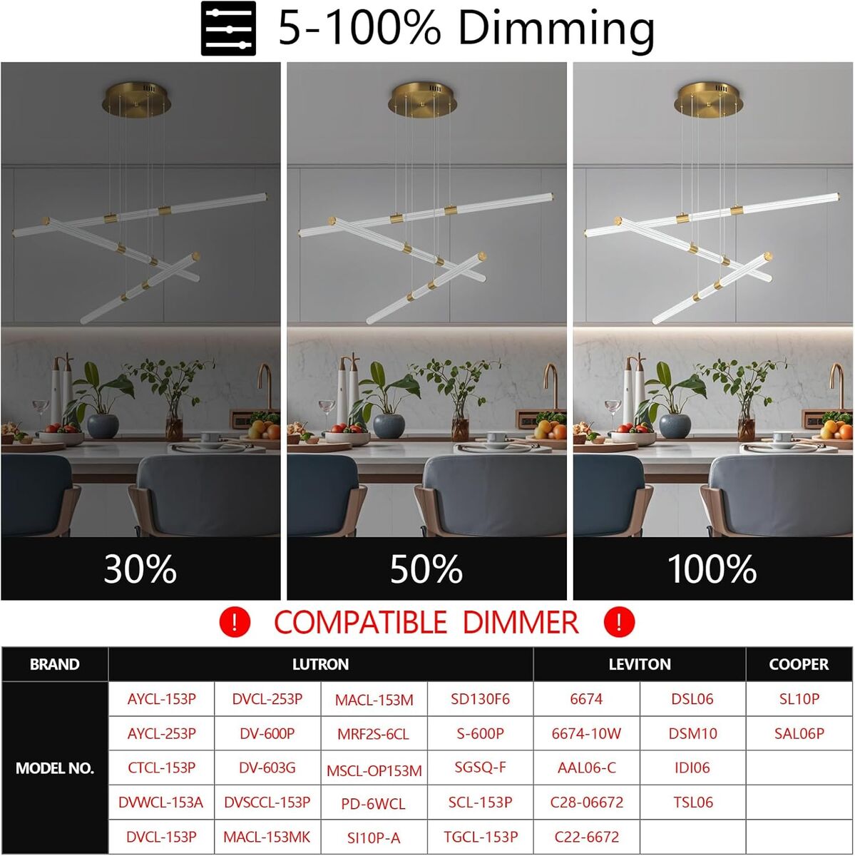 Dimmable LED ChandelierThis modern gold chandelier for dining room can be adjusted by remote control from 10-100% brightness (note: The lamp does not include remote control and dimmer switch). You can choose different brightness according to your needs.
