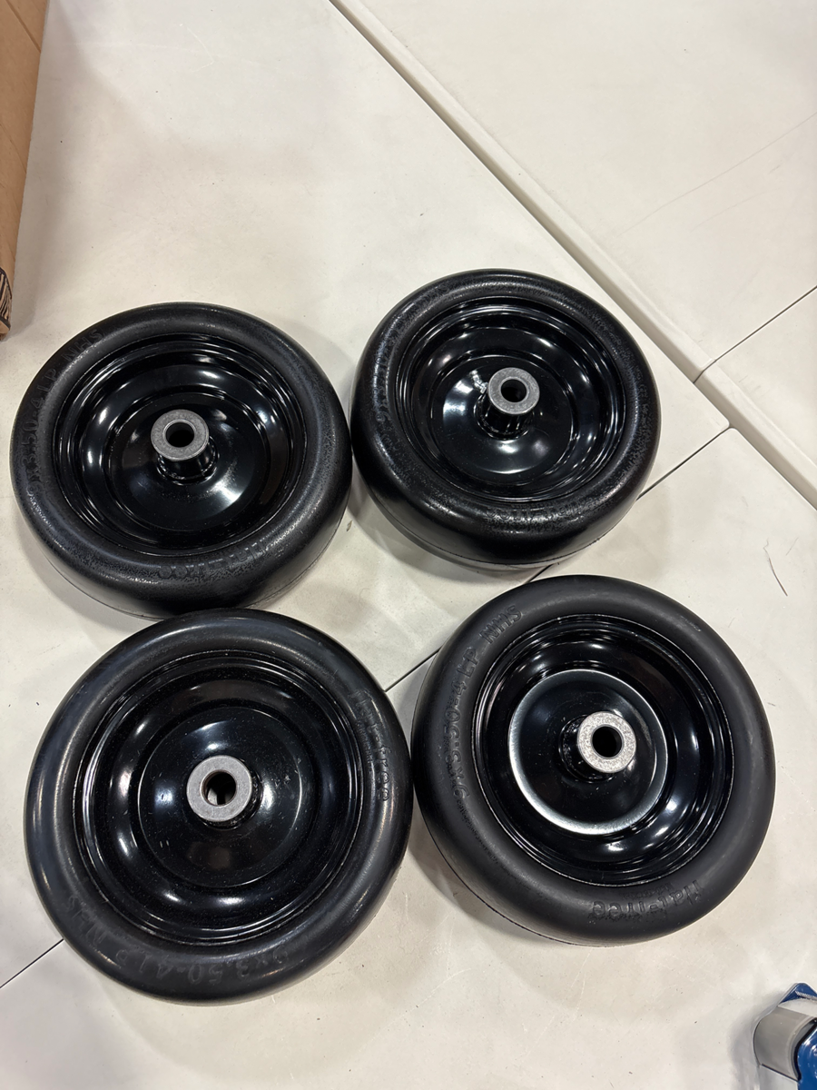 9X3.50-4” FLAT FREE LAWNMOWER TIRE AND WHEEL ASSEMBLIES - This tire and wheel assembly is a perfect replacement for lawnmowers with 9.29 inches tire diameter, 3.50 inches tire width, 4 inches rim diameter, 3/4 inch bushing/borehole size, and 4 inches centered hub length. Please check your existing tire’s sidewall to ensure that this is the right tire and wheel replacement for your lawnmower. FLAT-FREE POLYURETHANE TIRE ON WHEEL AND ADAPTER KITS - Our 4-pack kit includes 4 pieces of 9X3.50-4” flat-free PU tire and wheel assemblies with grease fittings and a universal adapter kit that allows assemblies to be mountable on a wide variety of wheeled equipment. The adapter kit includes 4 pieces nylon spacers, and 8 pieces of steel washers. COMPATIBLE SOLID RUBBER TIRE REPLACEMENT GARDEN CARTS - These tire and wheel assemblies are most often used not only on walk-behind lawnmowers, wheelbarrows, hand trucks, garden carts/trailers, air compressors, generators, and other types of wheeled equipment for both home and commercial use. MADE FROM HIGH-QUALITY MATERIALS - With a maximum load capacity of 300 pounds, each tire and wheel assembly can withstand any terrain. Made from yellow steel and polyurethane rubber. Almost unrecognizable from natural rubber, PU exhibits similar characteristics to rubber including excellent grip but without the weaknesses of rubber. PU is lighter, smoother, more durable, UV resistant, tear and cut resistant, weather-resistant, and non-marking. SAFE AND COMFORTABLE RIDE - Enjoy a smooth ride without the danger of explosive and constant punctures. These flat-free PU tires will remain functional even after multiple punctures and journeys across abrasive surfaces. Say goodbye to constant flats and say hello to a more efficient and convenient set of wheels.