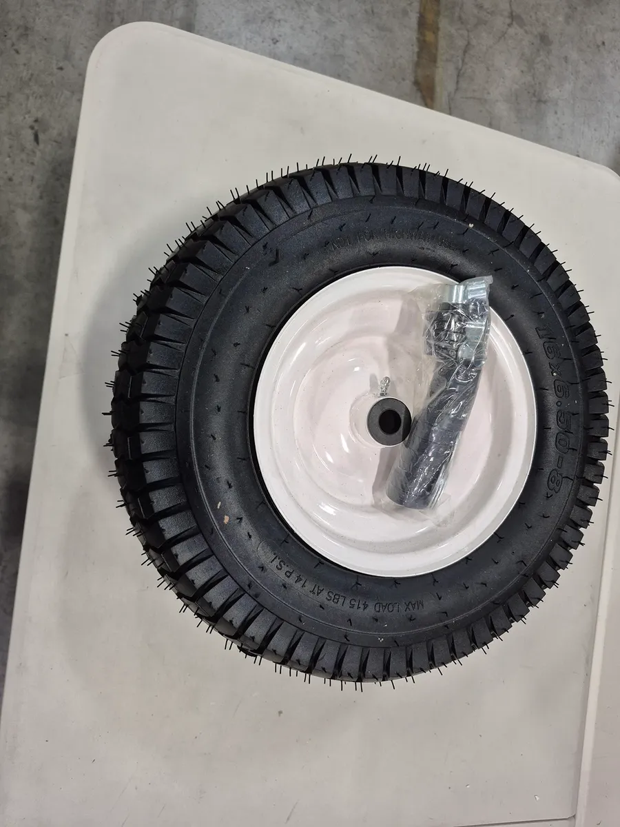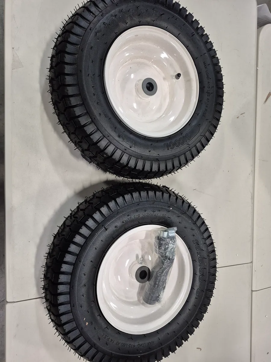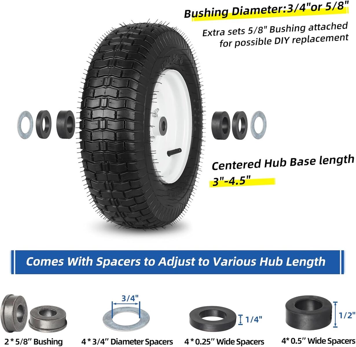 13x5.00-6” TIRES AND WHEELS: Tire Diameter 16"; Tire Width: 5.5"; Bushing Hole Diameter: 3/4"; Centered Hub Length: 3" -3.25" -3.5" -4" -4.5"; Dynamic Load Capacity: 300 LBS EXTRA ADAPTER KIT: The 16x6.50-8 solid tire is a pre-assembled 3" centered hub and 3/4" bore bushing. Considering that the wheel and bushing sizes of different, we also come with four 5/8" bore bushings, four 1/4" and four 1/2" wide nylon spacers, and four steel spacers, making it easy to adjust to various hub sizes HIGHLY ELASTIC RUBBER TIRES: The outer tire is made of an upgraded material with a higher rubber content, so a layer of fine hairs forms on the surface of the tire. This tire can withstand even the toughest driving conditions and provide reliable performance for years to come ONE-PIECE WELDED RIM: High-strength ONE-PIECE WELDED RIM to make sure it does not bend or fall apart with the hub when loading large capacity