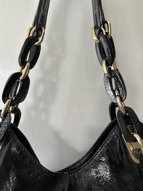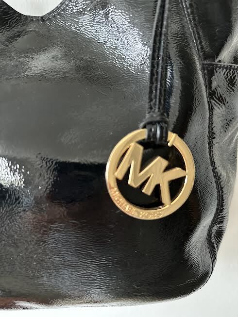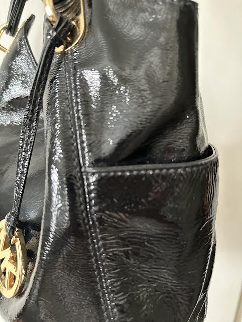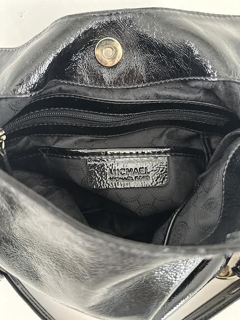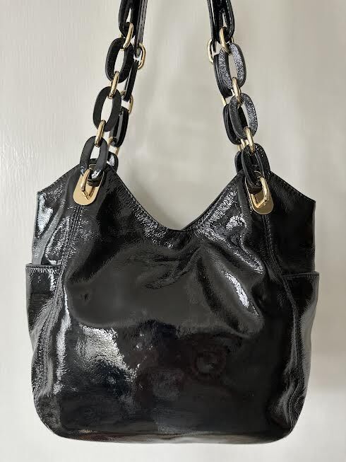 VenmoMichael Kors shiny black patent hobo style shoulder bag. Black shoulder strap loops intertwined with gold chain. Strap drop 11 inches. Soft buttery black patent leather. Side outside pockets. MK tag attached. One interior zipper pocket and four open pockets. Fabric interior lining. Gold tone hardware. Measures 14” W x 9” H x 4” W. Weight 1 lb. 10 oz. Excellent like new condition.