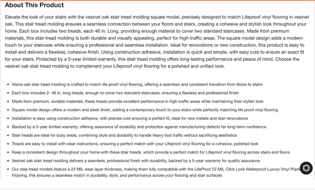 Features: Color: Vesinet Oak – beautiful wood-look finish 2 treads per box, each 46” long 100% Waterproof Scratch-Resistant 5-Year Warranty Seamless Installation – just cut, glue, and go Easy to maintain and clean Made in the USA