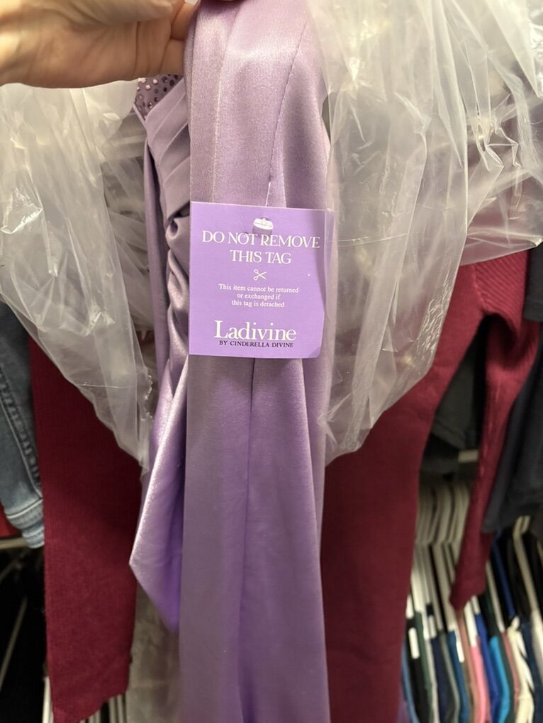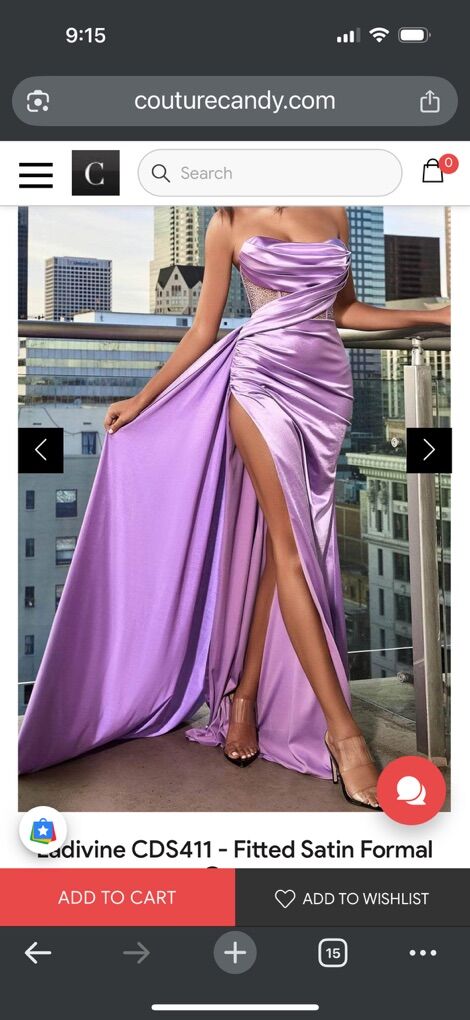 Elegant and beautiful, this Ladivine. Size 2. The strapless scoop neckline enhances the fitted ruched bodice. Underneath, the ruching, the corset top peeks at the sides with an elegant sequined design, The sheath satin skirt, in turn falls to the hips with a full-side draped overlay with a high slight balancing the look, and ending in a floor-sweeping train. Brand new. Never worn. Tags still on the dress. Doesn't fit me and I bought it on sale so unfortunately I can't exchange it for a bigger size.