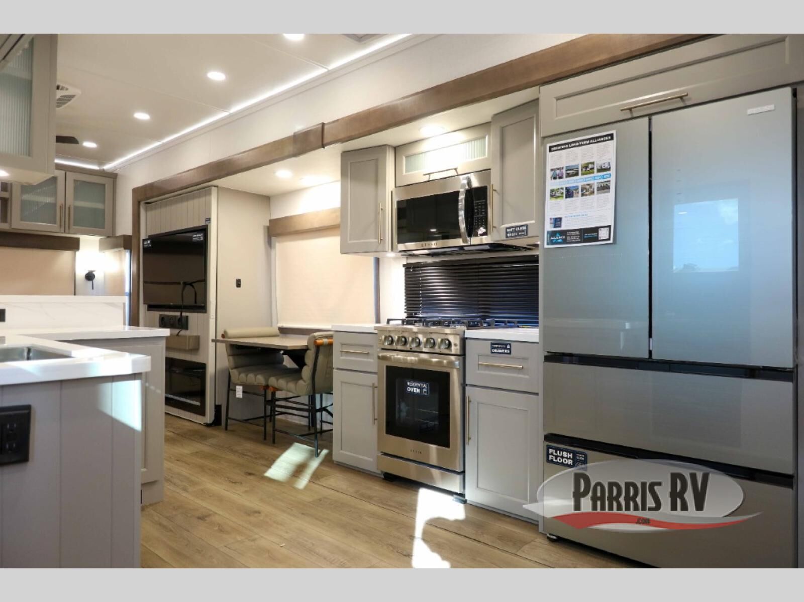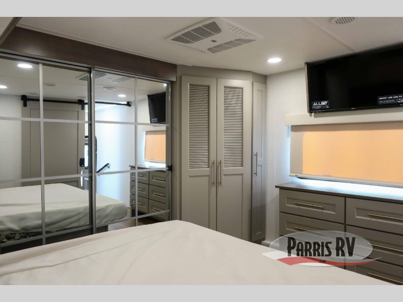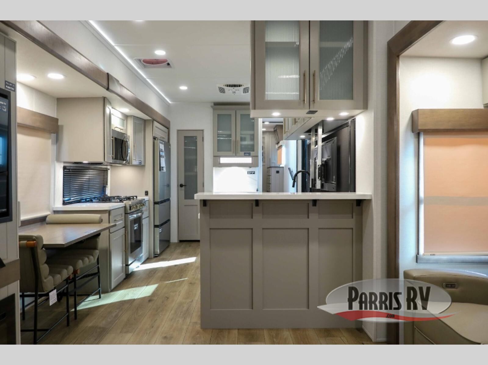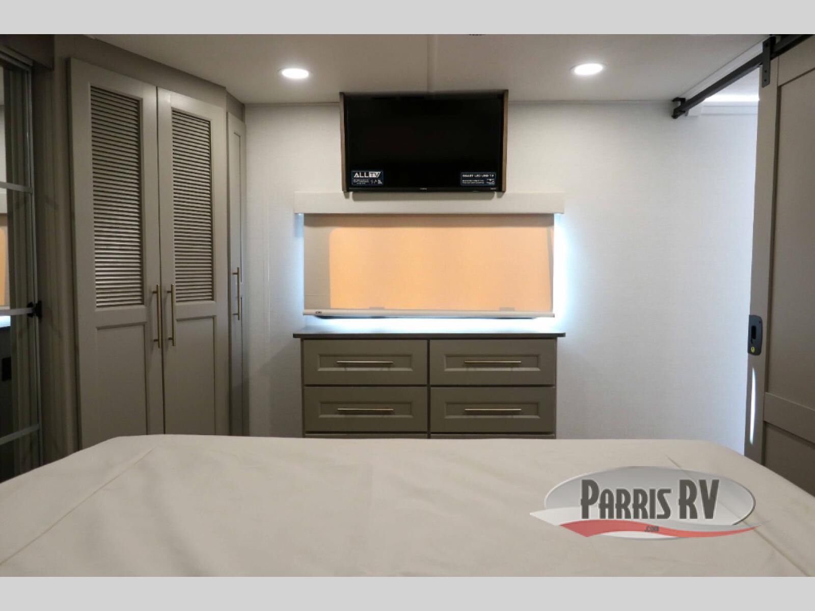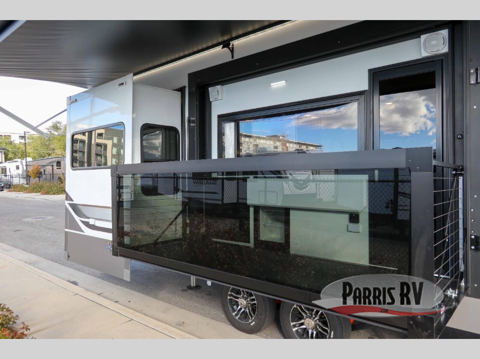 You will fall in love with this unit's slide patio with picture window, the perfect spot to take in the breathtaking views. Enjoy outdoor cooking with the countertop prep area and pull-out grill, while the drop-down TV provides entertainment for all. Inside, rear living area features two sleeper sofas, perfect for lounging and relaxing. Overhead cabinets provide ample storage, while the 50" class smart TV offers endless entertainment options. Gather around the turn table dinette for meals or socializing. The kitchen is fully equipped with a microwave, sink, refrigerator, pantry, and hutch, making meal preparation and storage a breeze. Also this unit has a full bathroom and a cozy front bedroom which boast a king bed, ample closet, a TV, and so much more!