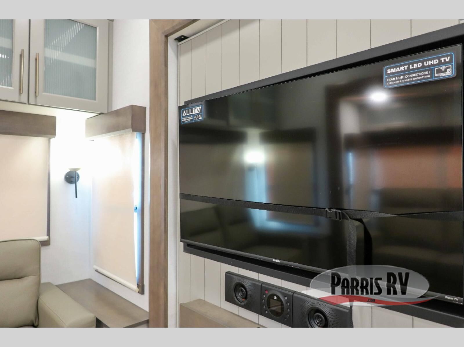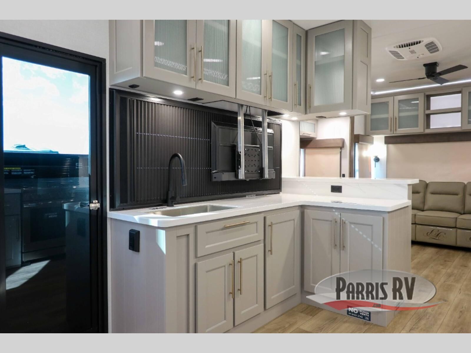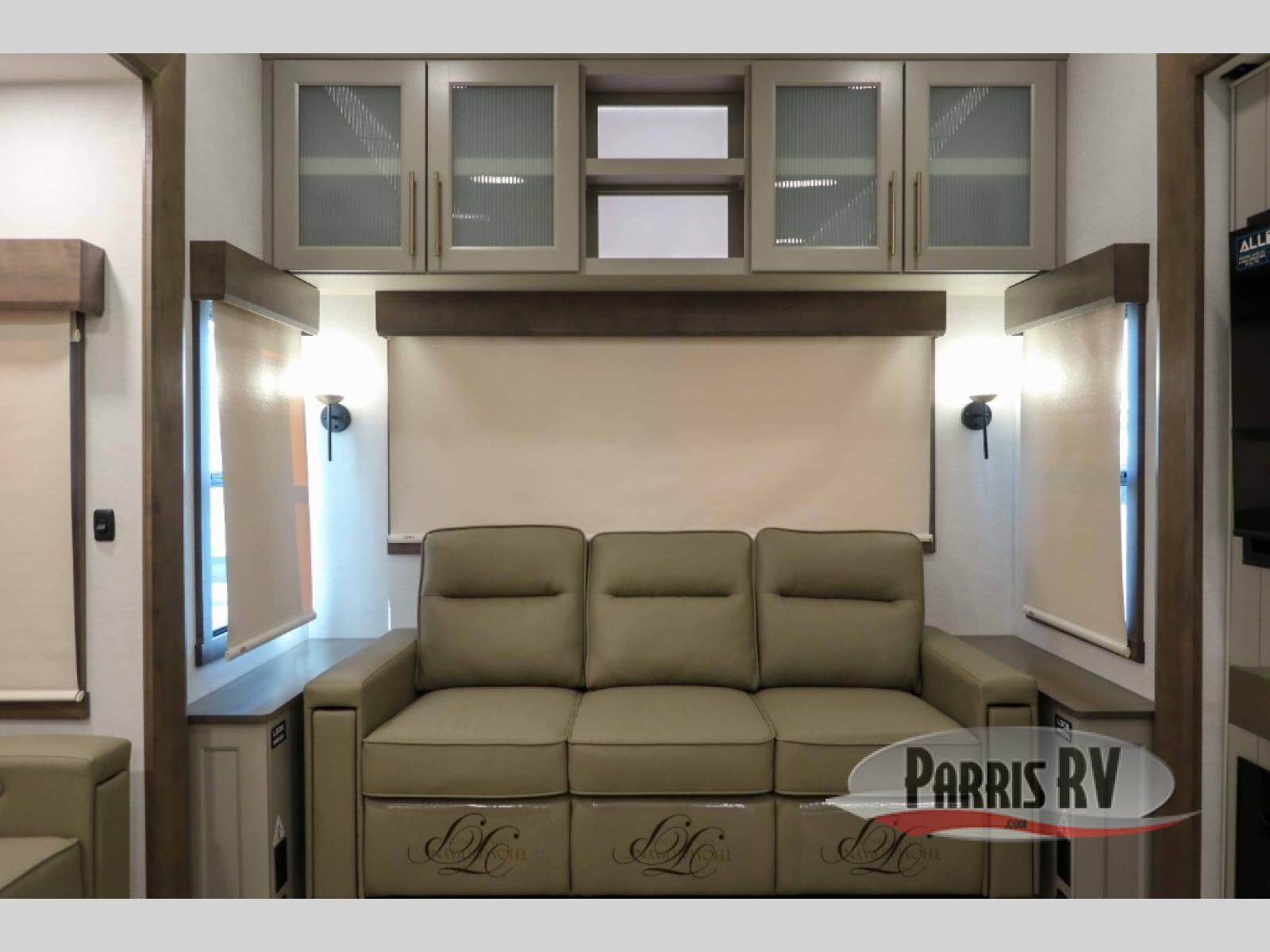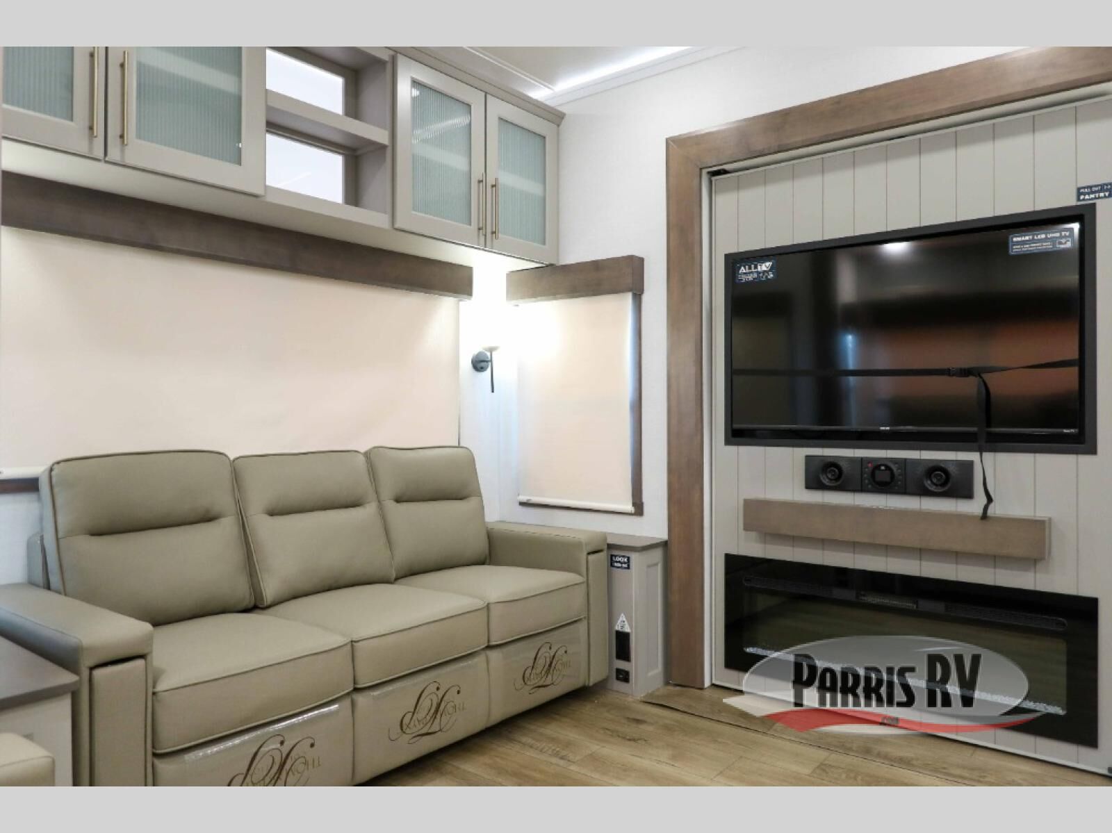 You will fall in love with this unit's slide patio with picture window, the perfect spot to take in the breathtaking views. Enjoy outdoor cooking with the countertop prep area and pull-out grill, while the drop-down TV provides entertainment for all. Inside, rear living area features two sleeper sofas, perfect for lounging and relaxing. Overhead cabinets provide ample storage, while the 50" class smart TV offers endless entertainment options. Gather around the turn table dinette for meals or socializing. The kitchen is fully equipped with a microwave, sink, refrigerator, pantry, and hutch, making meal preparation and storage a breeze. Also this unit has a full bathroom and a cozy front bedroom which boast a king bed, ample closet, a TV, and so much more!