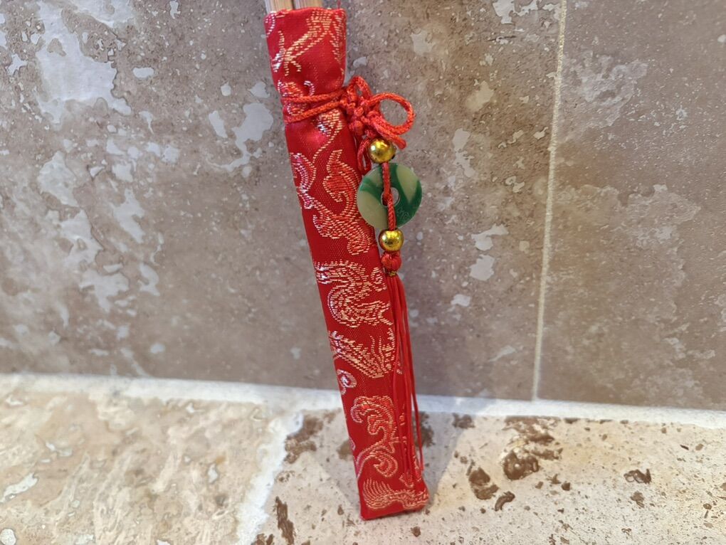 I have a new red chopstick sleeve or pouch with gold dragons on it. It has ties with a green jade-like disk. You can have the chopsticks too but they are inscribed with names and a wedding date. See my other ads for jewelry, artwork, home decor and more.