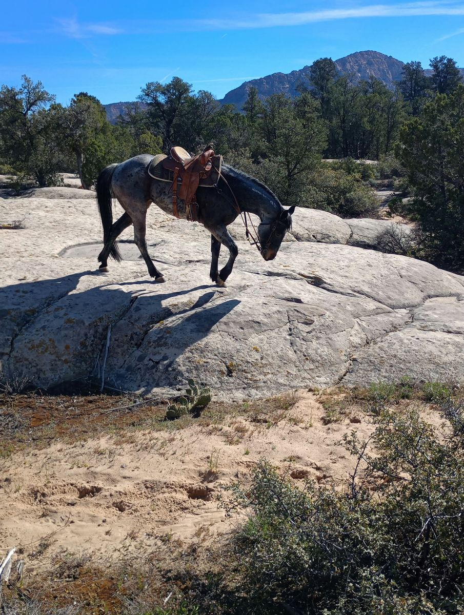 She is good to handle on the ground and in the saddle and is up to date on a professional barefoot trim. She will have a new barefot trim on the third of April.
