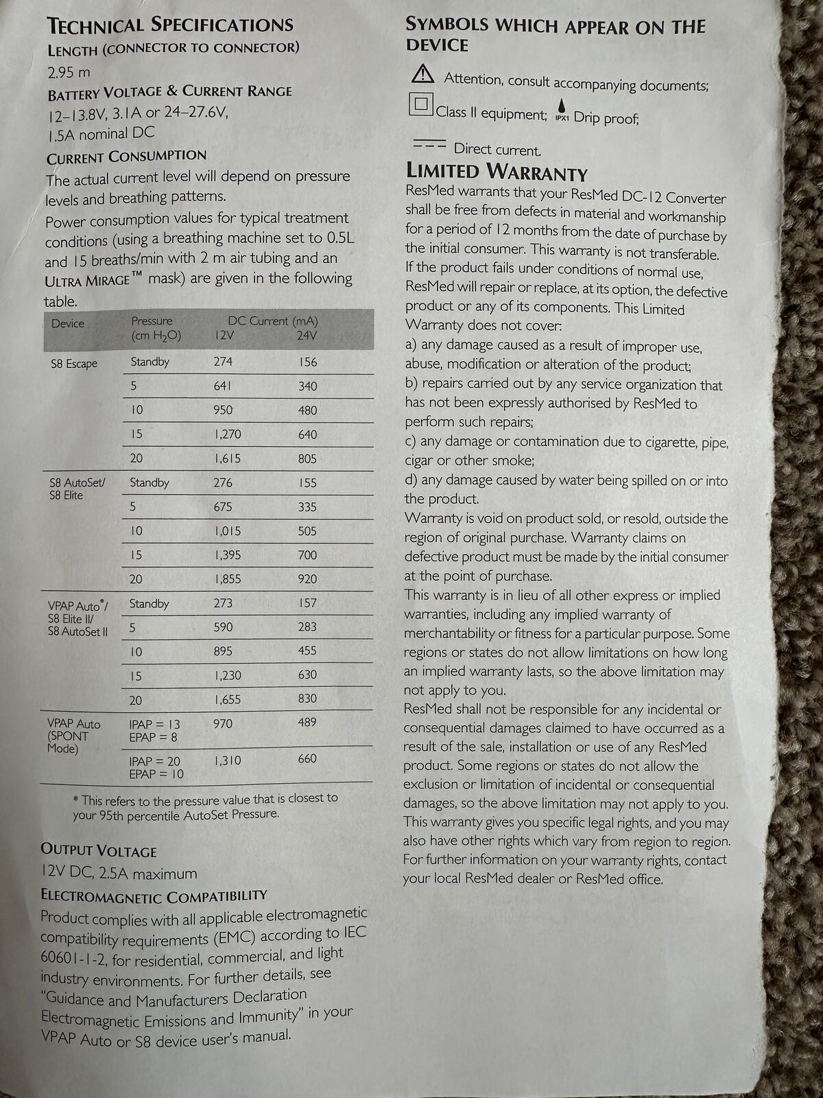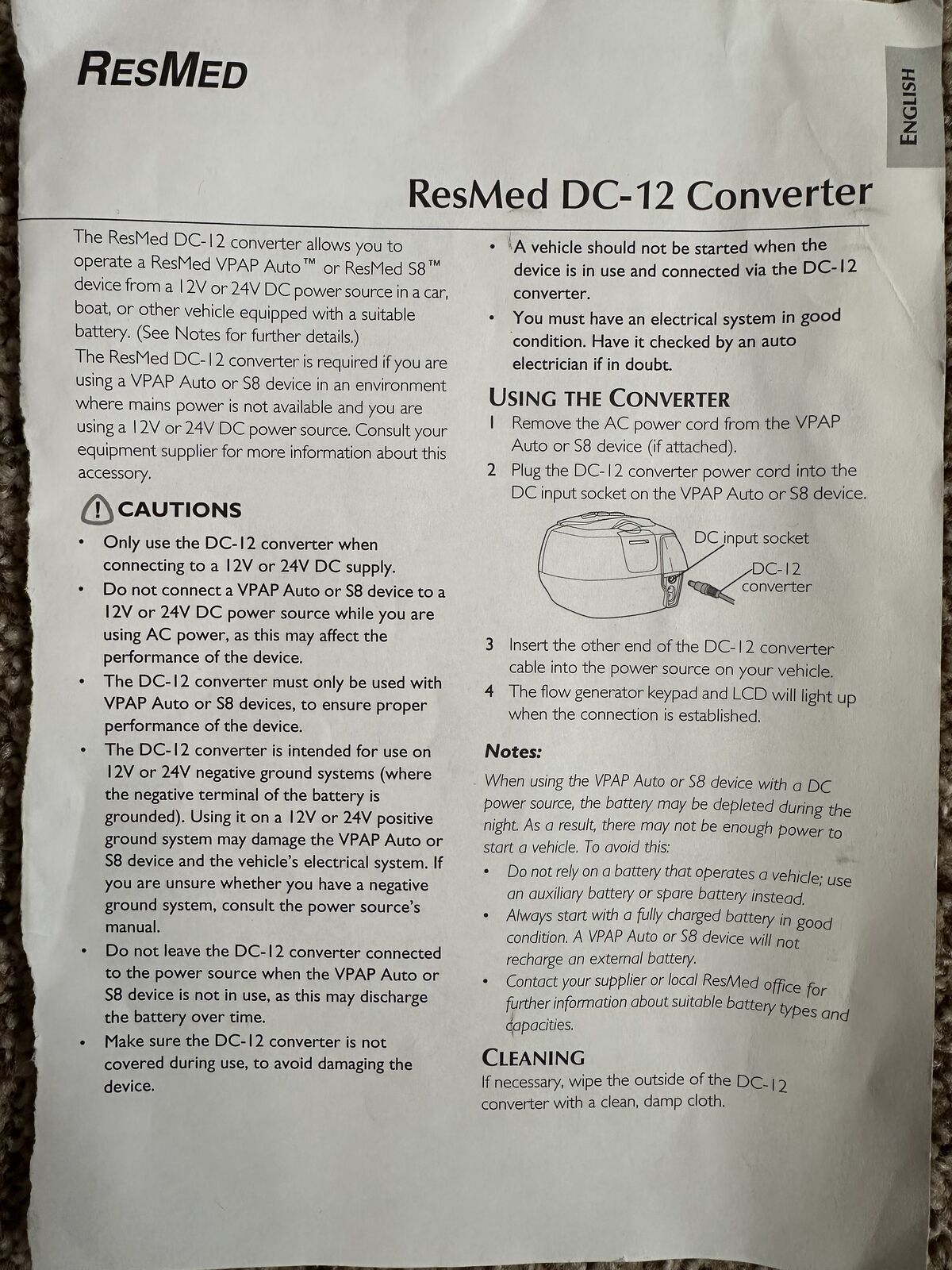 VenmoResMed OEM DC-12 Converter. Allows you to operate a ResMed VPAP Auto or ResMed S8 device from a 12V or 24V DC power source in a car, boat, or other vehicles equipped with suitable battery. CPAP Battery Inc Lithium Ion 8.8Ah Battery Pack. See chart for estimated run times. This also comes with an AC to DC charger to charge the battery pack. Very convent way to operate your CPAP when you are camping.