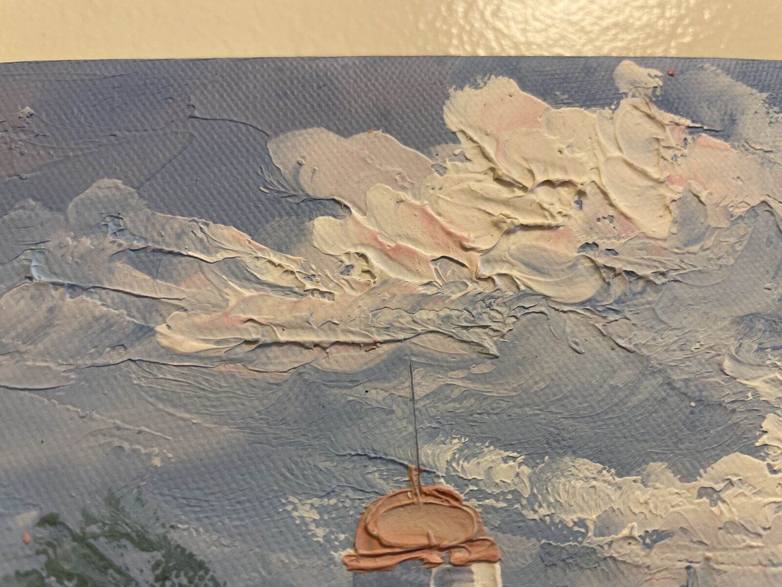 The painting measures 20" tall x 24" wide. There isn't a hanger on the back of the painting but there's a lip on the piece so you can hang it on the wall.