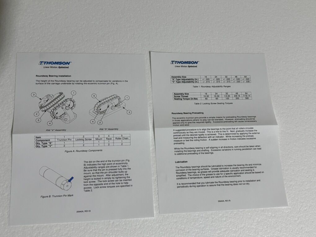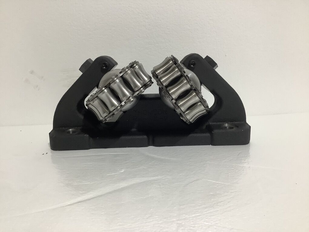 Thomson RoundWay Linear Roller Bearing, Dual Type V, 3 in Shaft Dia, 6.69 in Width, 2 in Length, 35000 lb Dynamic, Carriage Mount Style, Steel Bearing, Oil Lubrication, 500 deg F Travel speeds up to 100 ft/s Accelerations up to 450 ft/sq-s Can be adjusted to compensate for variations in the mounting surface Self-aligning in all directions Easily mounted to carriage with four mounting bolts A dimension infinitely adjustable within +/- 0.030 in range