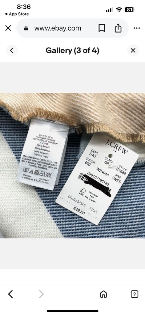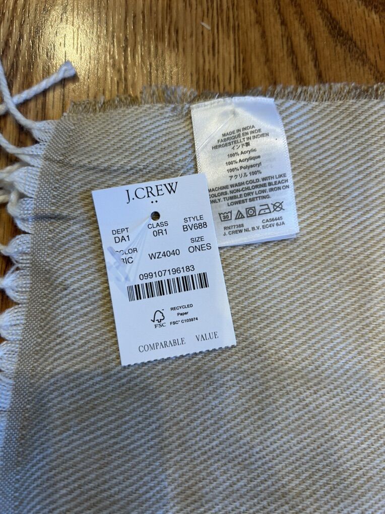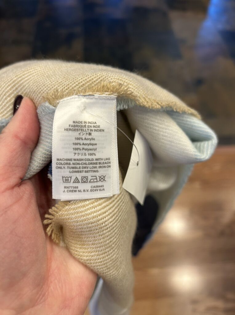 VenmoNew with tags from J.Crew, blue cream and tan acrylic scarf measuring 25 inches across 77 inches long. Beautiful classic color blocking soft, smooth. Clean smoke free. pick up in Alpine. Cash or Venmo.