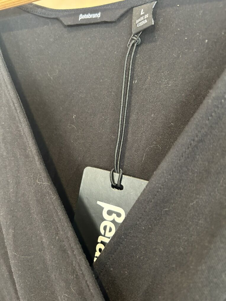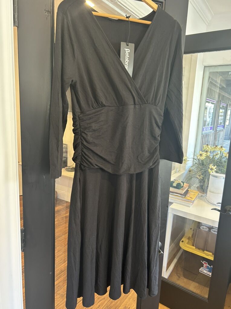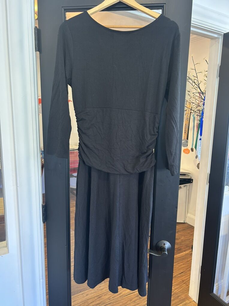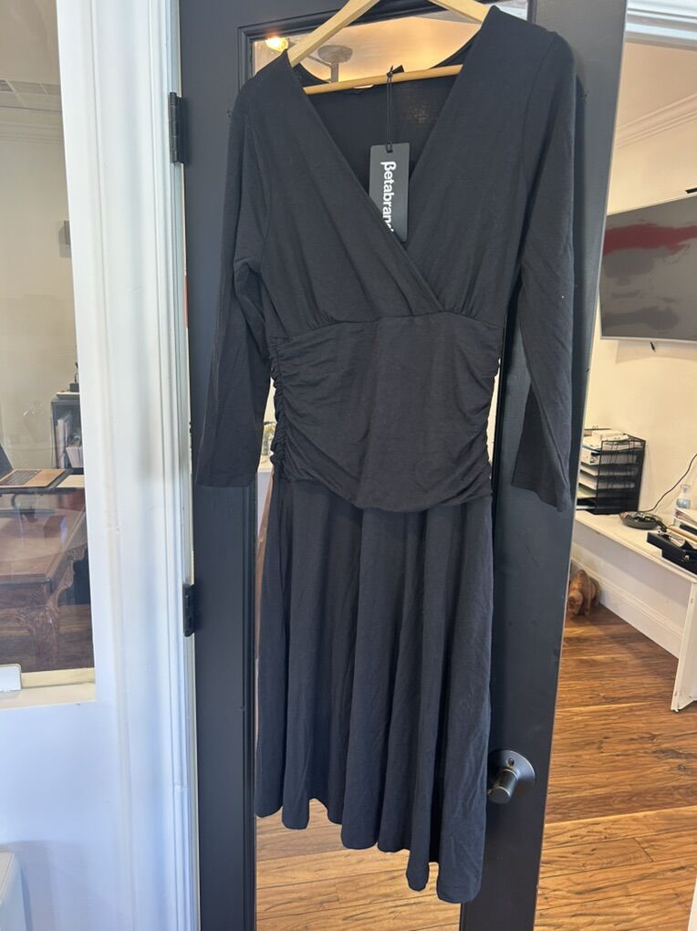 ZelleThis Betabrand Soft Women's Dress in size Large is a versatile and stylish option for various occasions. The dress features a V-neckline, a pullover closure, and ruched sides for a flattering fit. Made from a comfortable jersey fabric with a mix of silk, spandex, and modal, it offers a stretchy and comfortable feel. The midi length and long dolman sleeves add a touch of bohemian flair, while the black color and solid pattern make it a classic and versatile piece that can be machine washed for easy care. Perfect for fall or spring travel, parties, casual outings, or business events.