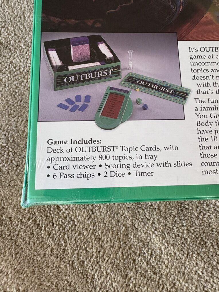 NEW (sealed in plastic) 1994 Outburst: The game of verbal explosions! With updated topics. Parker Brothers, Hasbro, 1994. New, unopened condition. Text only. Cash or Venmo.