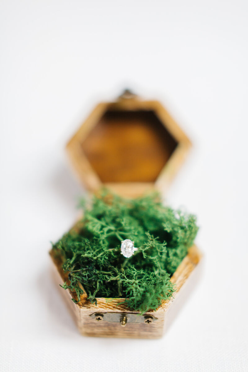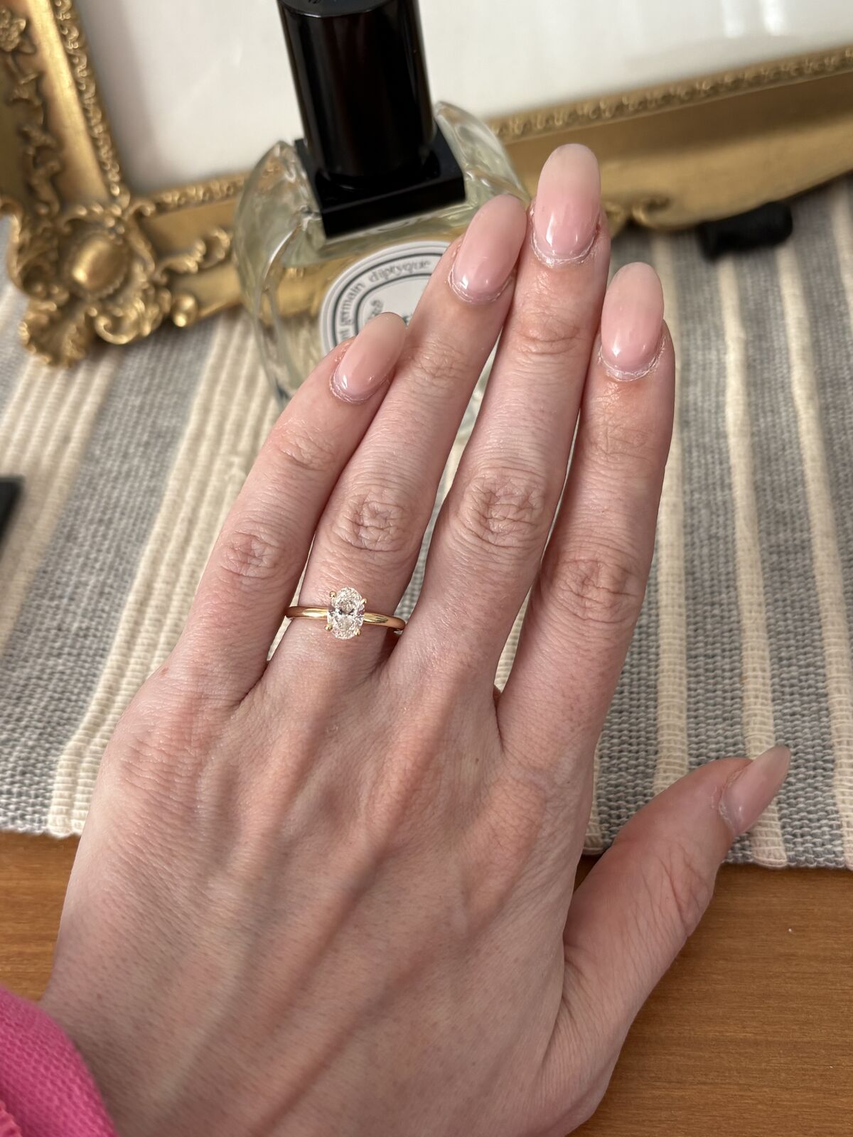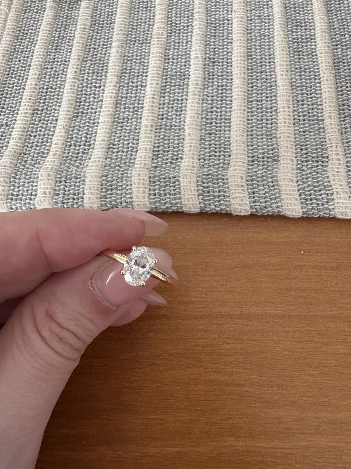 Diamond cut: Oval Carat weight: 1.00 Color: G Clarity: SI2 Band is 14K gold, size 6.5 (can be resized for free)
