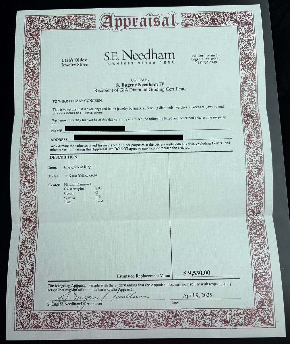 Diamond and band in excellent condition. See photos for official appraisal details. Original appraisal included with ring.