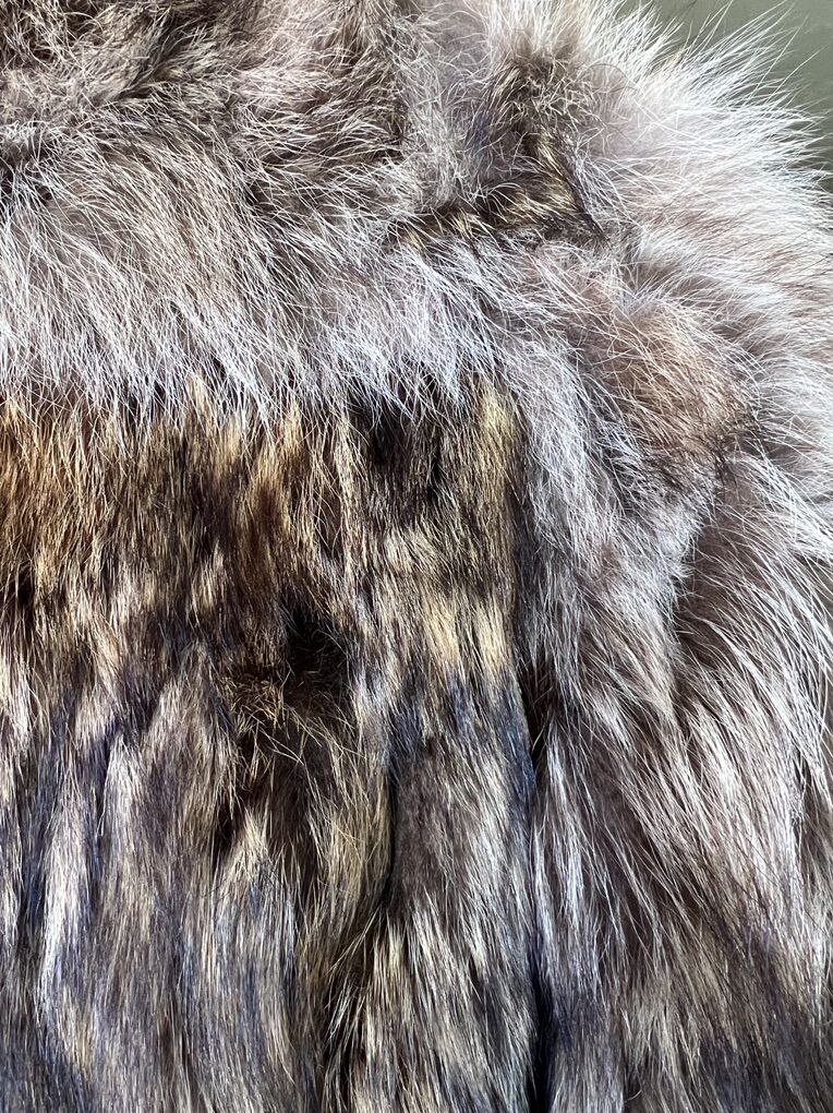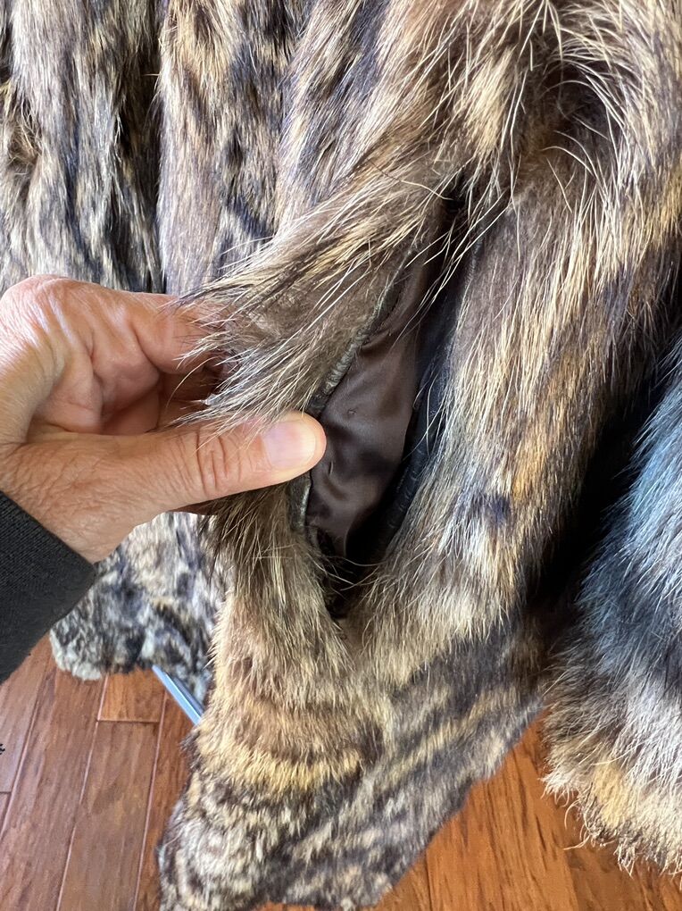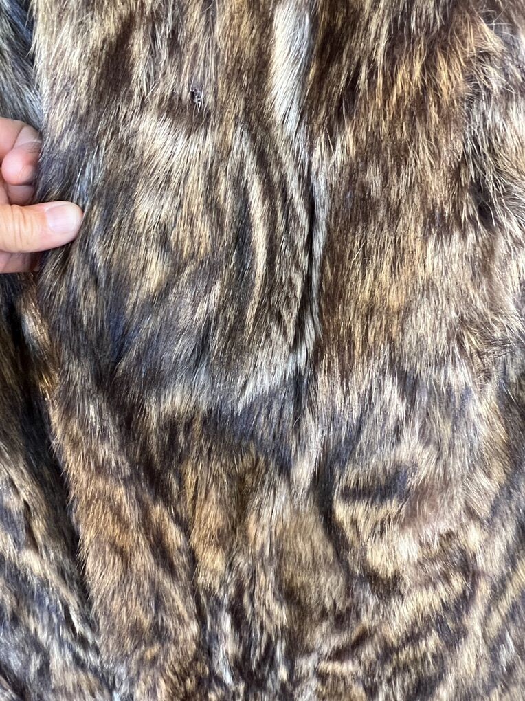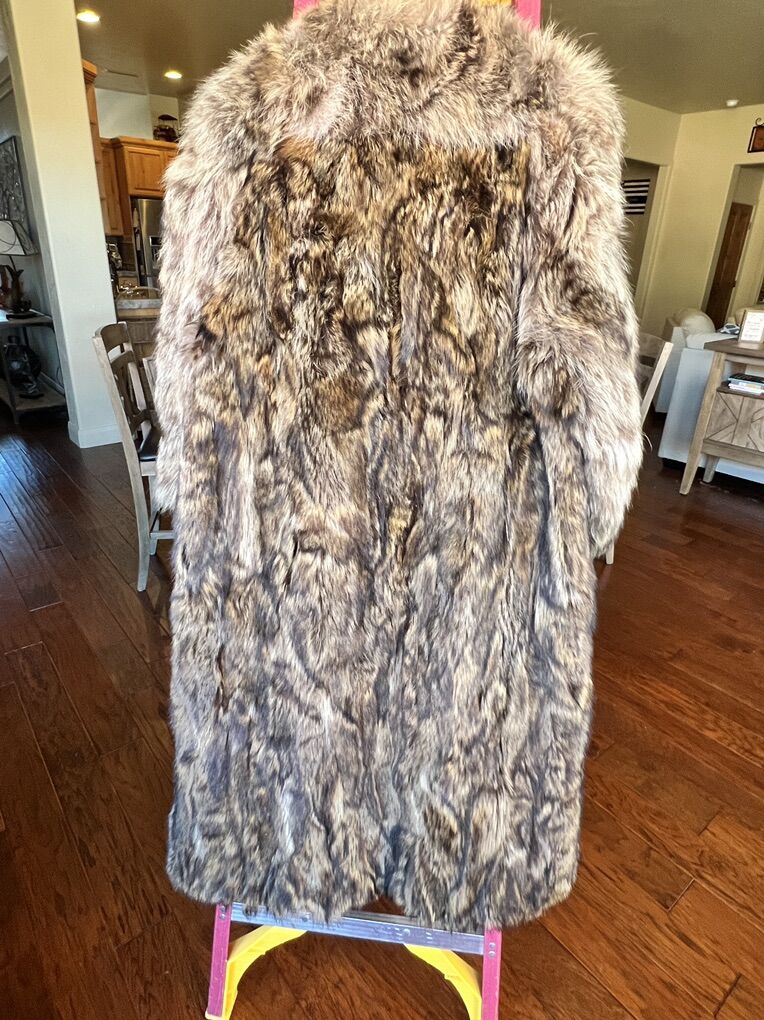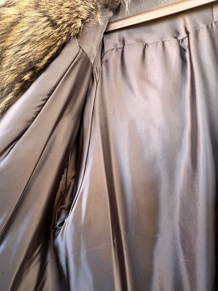 Beautiful large/extra large genuine raccoon coat. Rarely used, in excellent condition. Fully lined. 2 pockets, hooks for closure. The only irregularity is shell lining around the collar is slightly separated. However, this reveals the genuine raccoon fur.