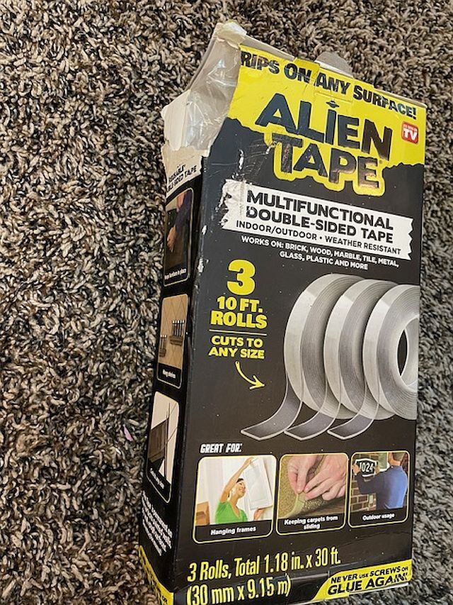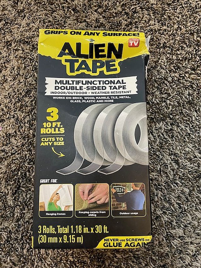 SAFE ADHESIVE CLEAR TAPE: This super adhesive tape goes on clear and with its nano-grip technology, the tape will not leave any trace on the object after use. STRONG ADHESIVE, EASY TO CUT: Just because the tape is tough it doesn’t mean you will have a hard time cutting it. EASY TO USE: Alien Tape is good to use for any strong hold. Simply add to the back of the item, trim and stick to any surface! MULTIPURPOSE: Use on walls, holding down rugs to prevent slipping, holding phone up while driving, decorating for the holidays and much more! FCFS & Hold: First-come, first-serve. 4-hour hold – after the 4 hours, item will be opened back up; partial to full payment will be required to hold past the 4 hours.