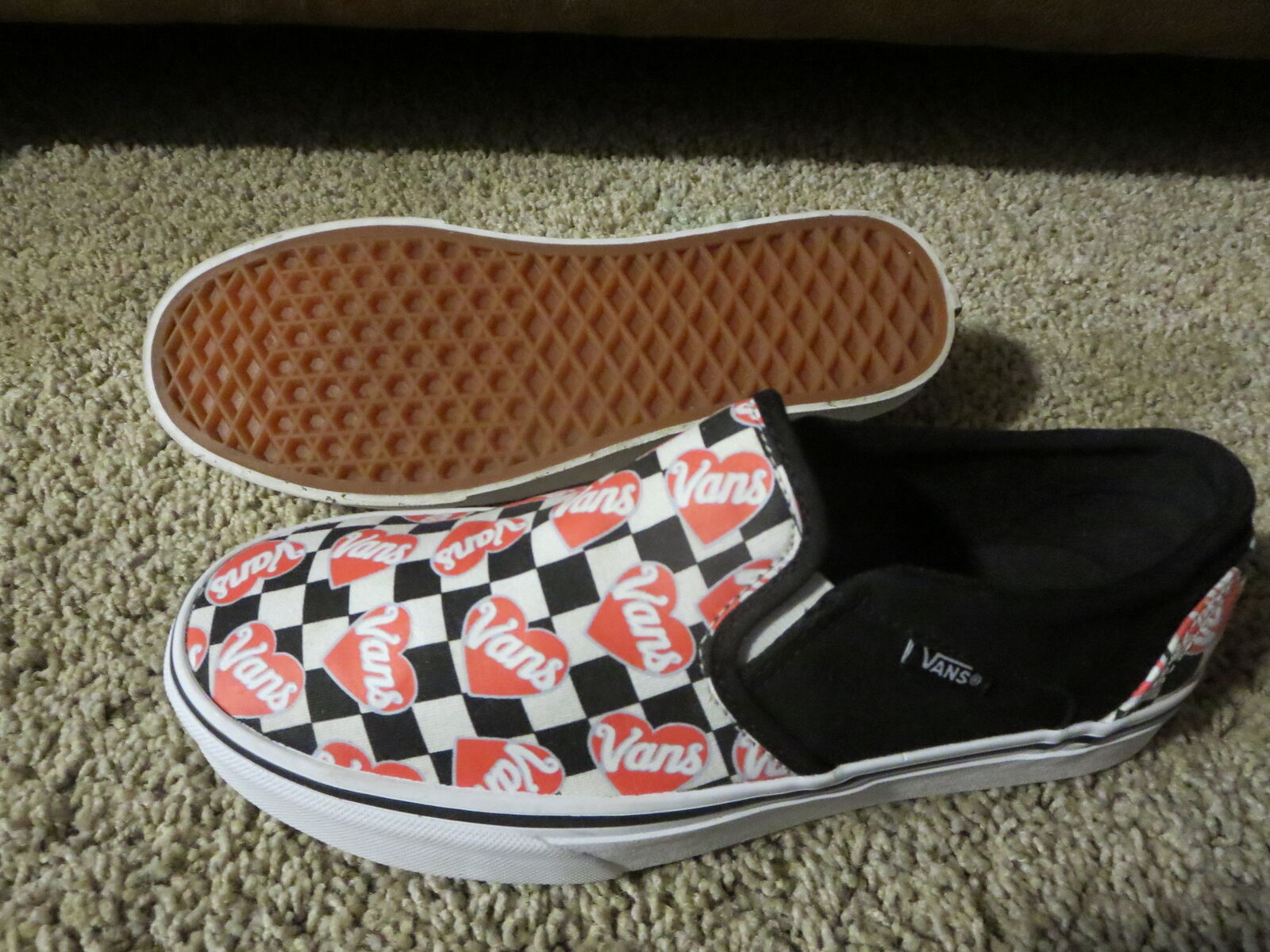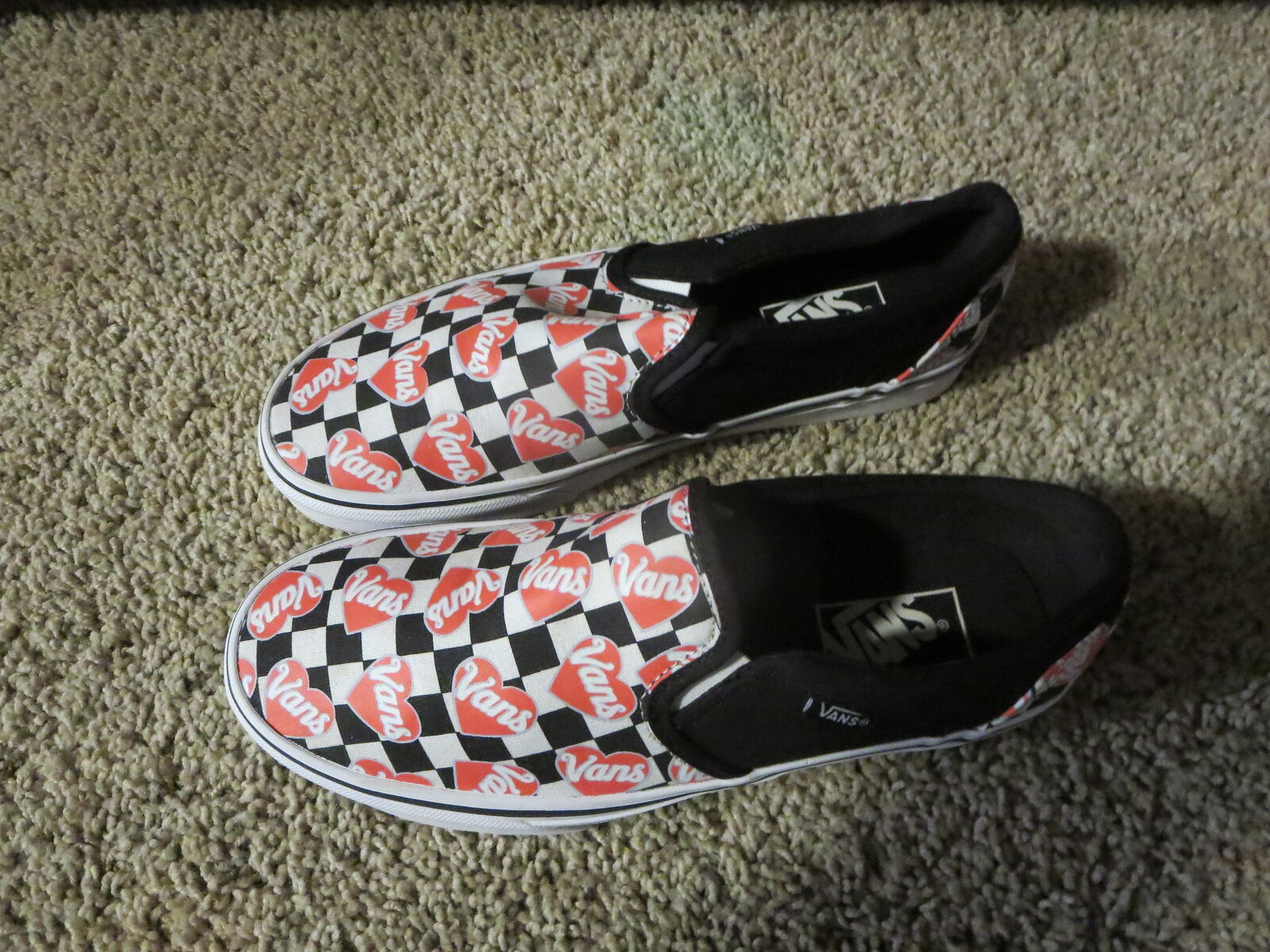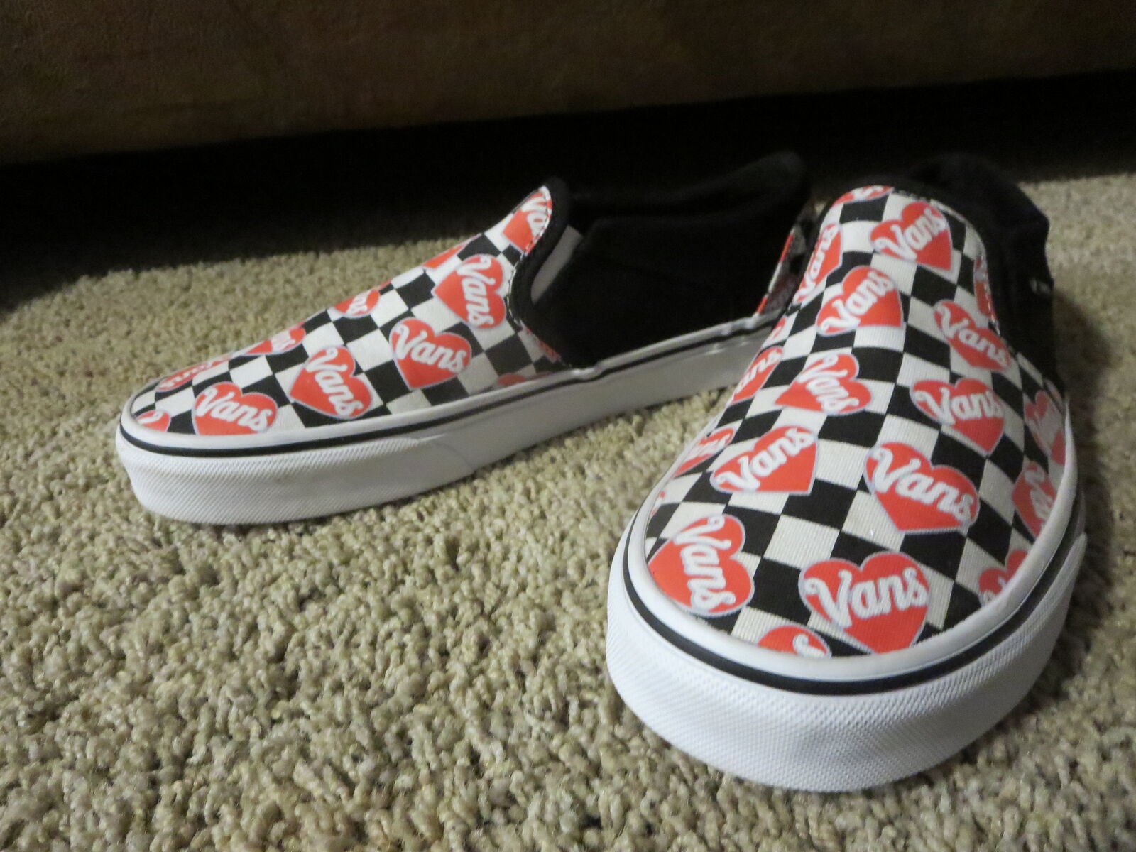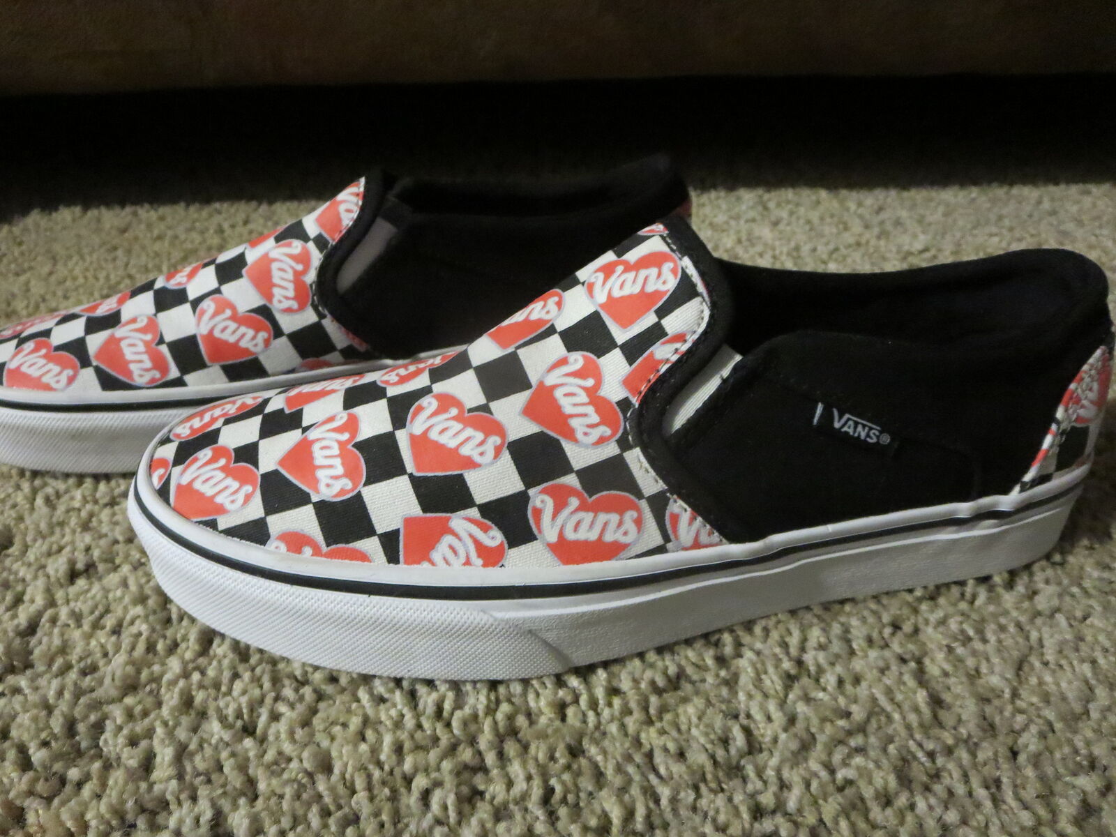 I have a new pair of. Women's Van's red & black checkerboard white hearts size 9.0 for sale call or text only thanks for looking D.