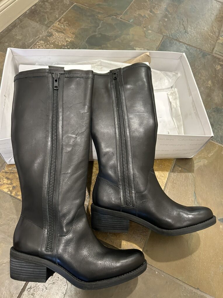 VenmoNew in the box 100% genuine, leather black tall boots from Calvin Klein. Gene style. Dual metal zippers on boots. Thick soft, black leather. Clean smoke free. Cash or Venmo. Pick up in Alpine.