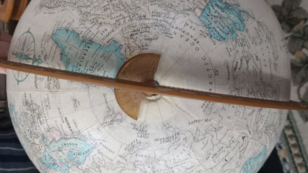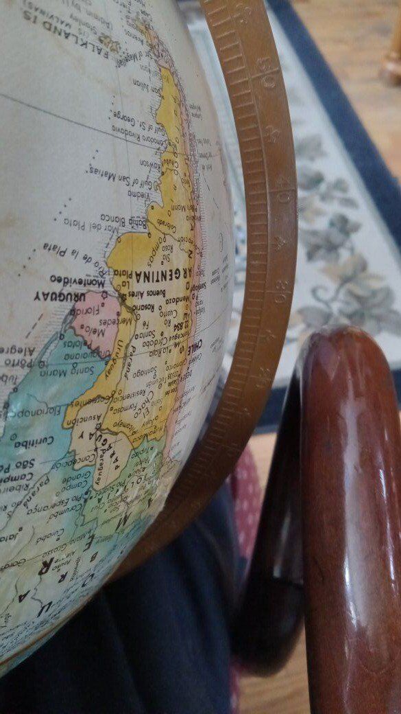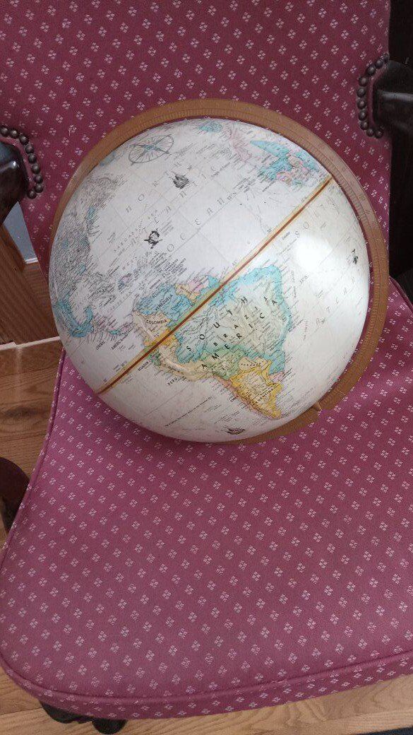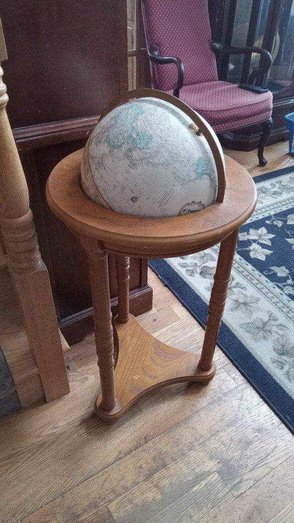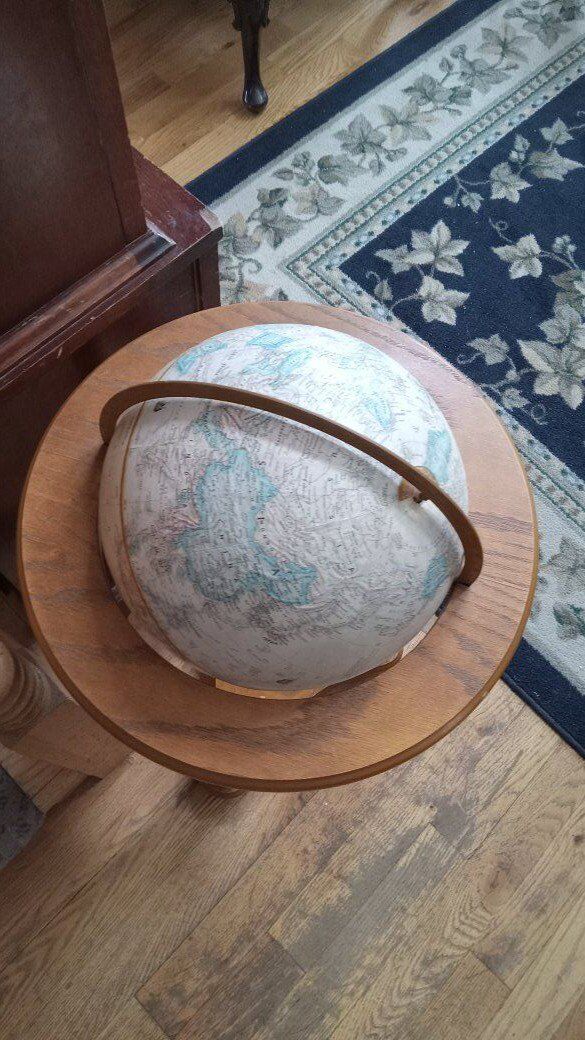 Venmo(Price reduced on 12/8) Up for sale is an antique world globe of earth by Globe Master on a floor standing wooden stand with wheels. The globe has elevation relief of the mountain ranges and a fairly accurate scale representation of the land masses and countries around the world. The stand has a rotating removable spinning ability also for easier showing and teaching of the geography of the earth. Measuring 12" diameter globe and 28.25" Height X 15" Width Stand and approximately 35" total height. This globe with stand is in overall good condition with some small scuffs on the bottom of the stand. The top side of the globe has some sun fading of the colors (the colors aren't as bright on the top as compared to the bottom). The top of the globe has a small circle piece of plastic that is broken in half. See in pictures.