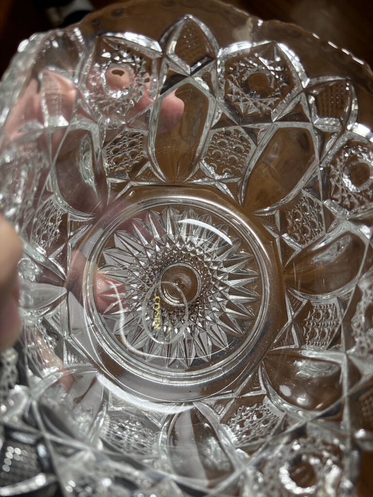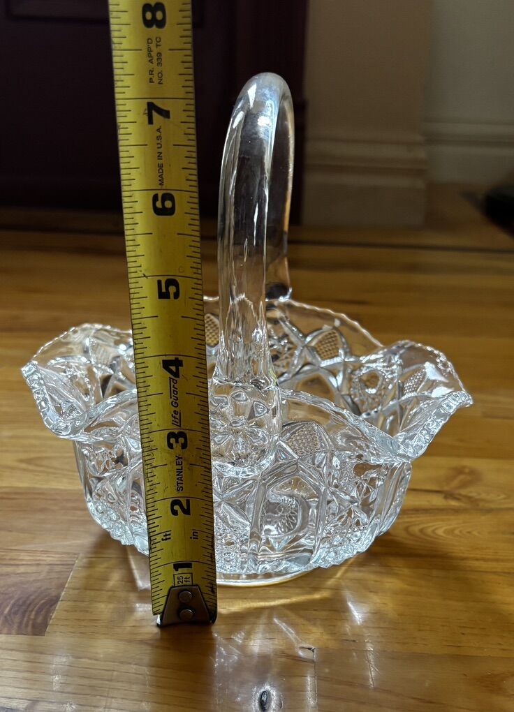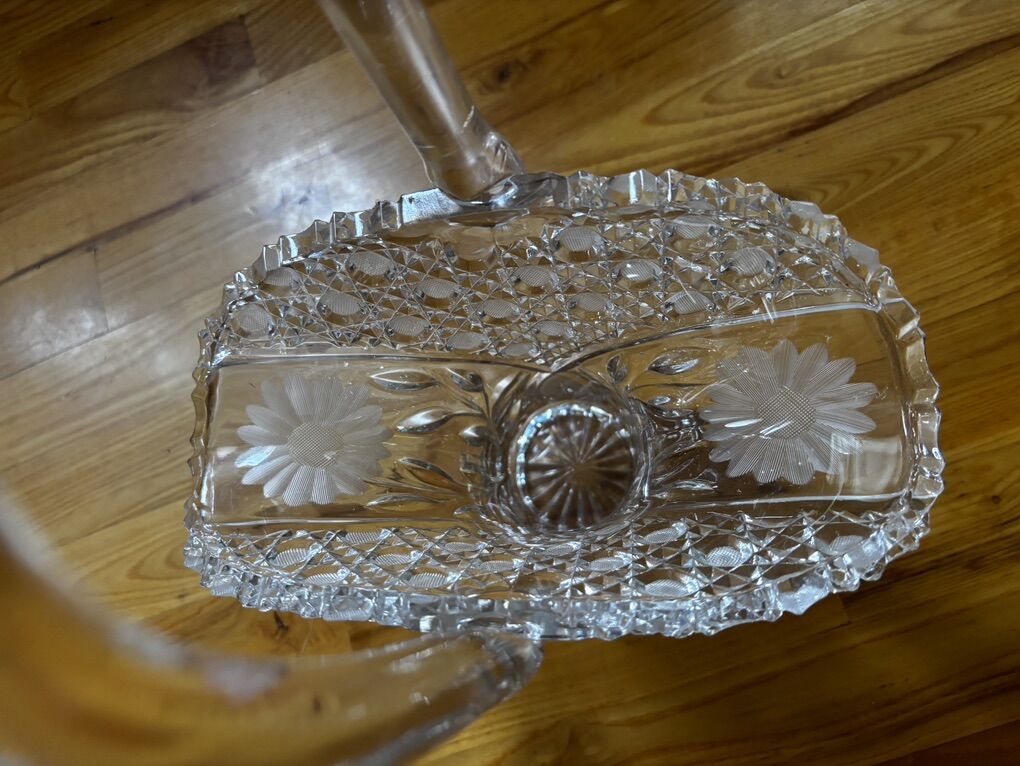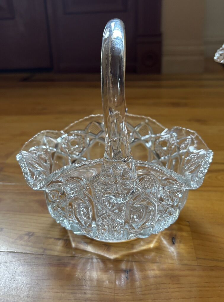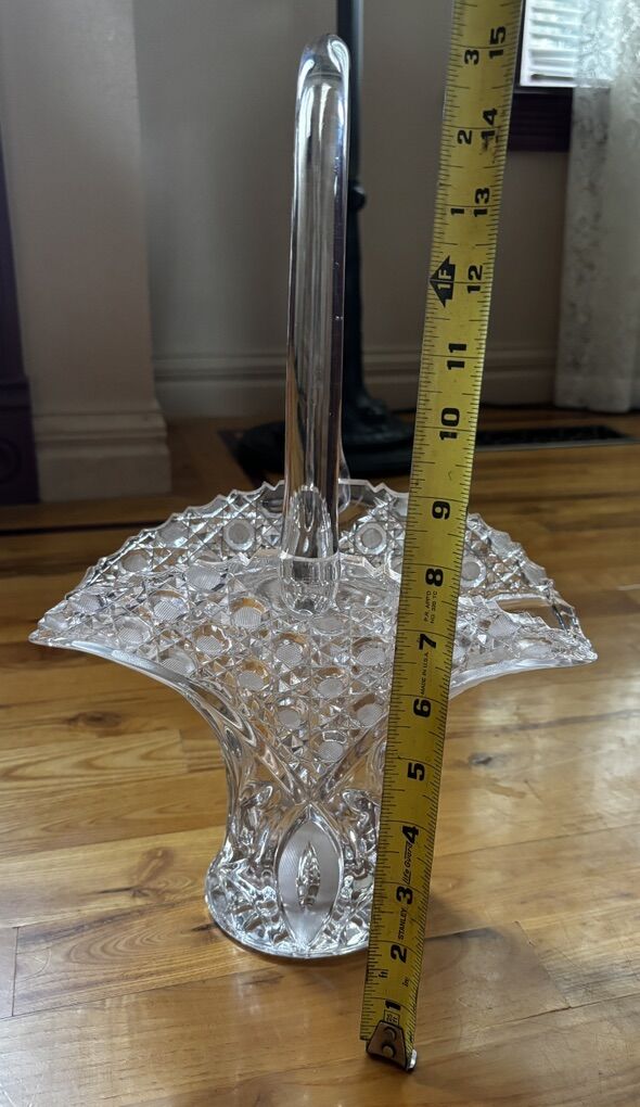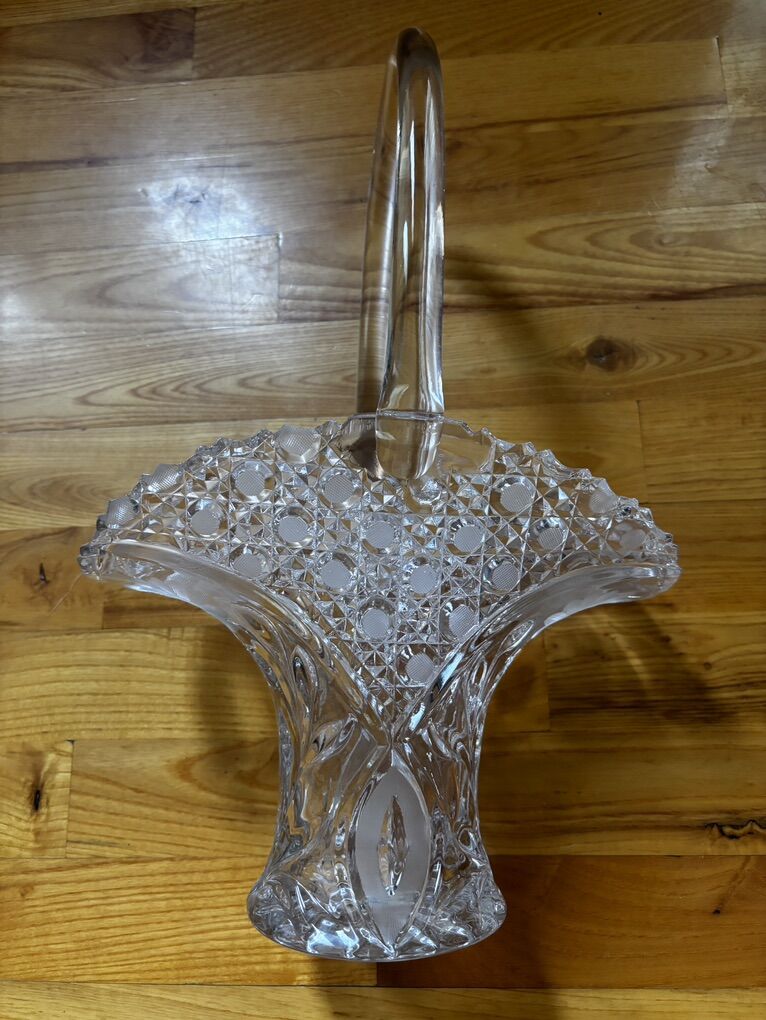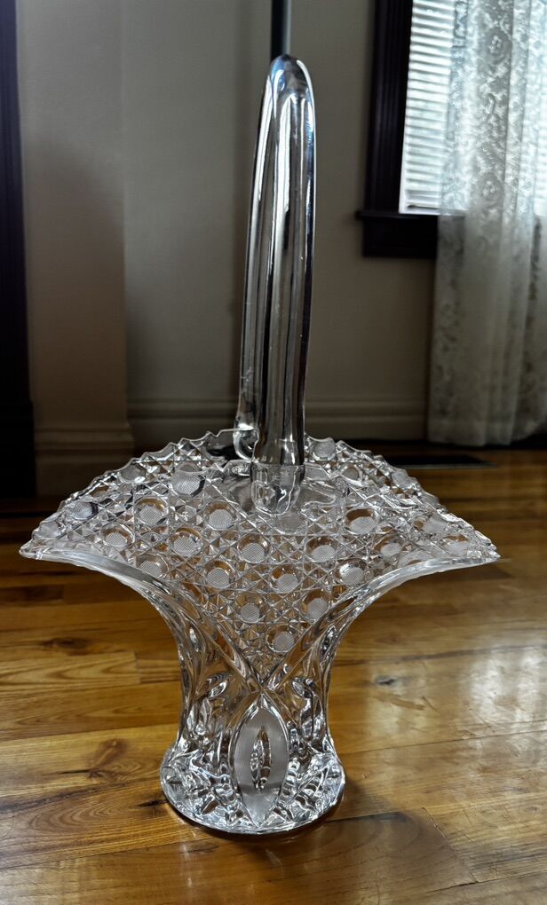 Small Crystal Basket & Large Glass Basket – Decorative Pair - $50 for both Add a touch of sparkle and charm to your home décor with this beautiful pair of decorative baskets. The small basket is crafted from fine crystal, catching the light beautifully with its intricate cut design. The larger basket, made of quality glass, features a similar elegant shape and makes a lovely complement to the crystal piece. Perfect for display, gifting, or as accent pieces for a dining table or curio cabinet. Both are in excellent condition with no chips or cracks. Dimensions: See photos for exact measurements.