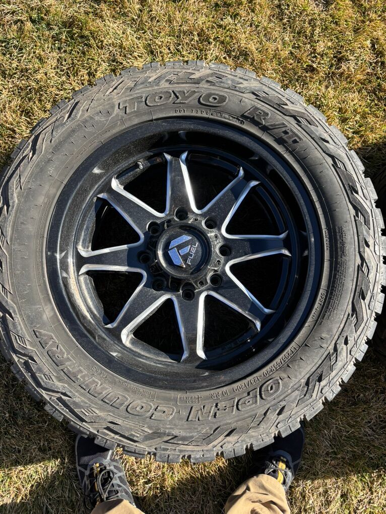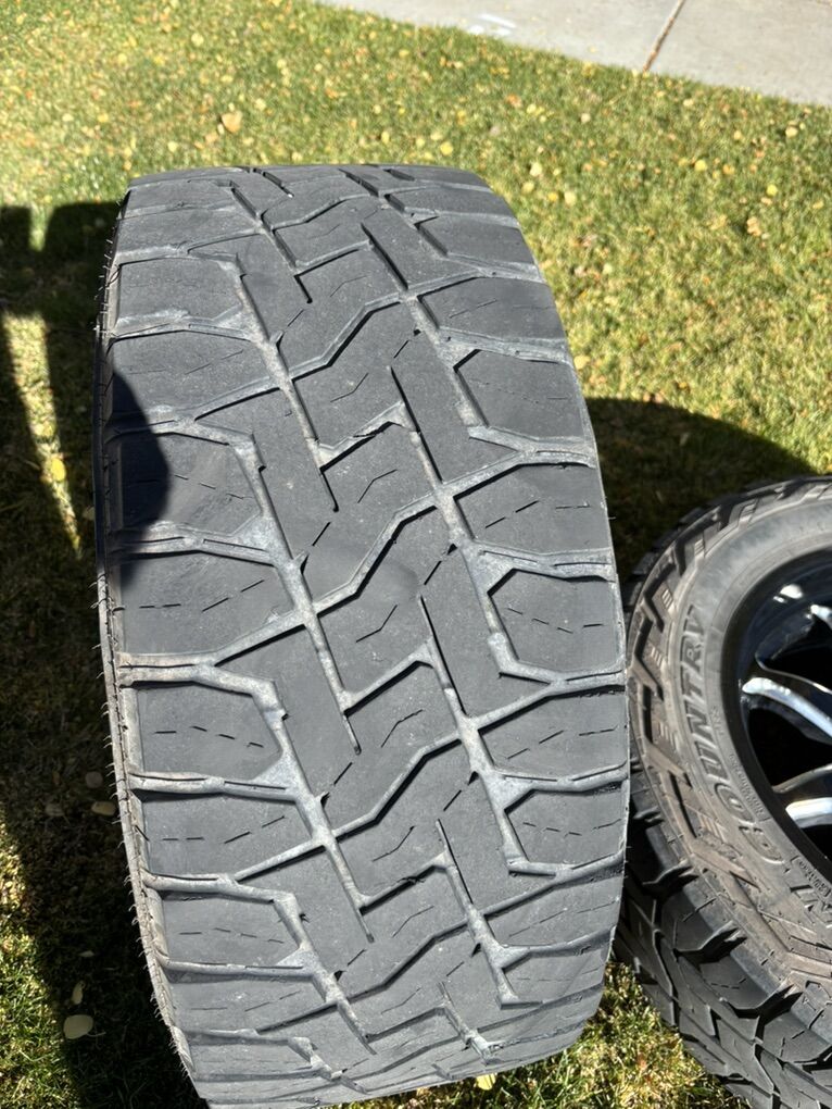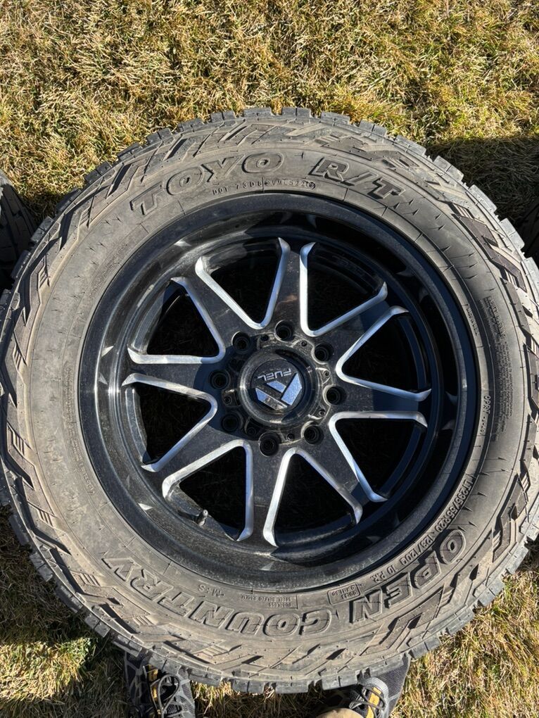 8x180 lug pattern Fits 2011 to present 8 lug trucks Toyo LT290/55R20 Open Country tires have about half of the tread left Sensors and lug nuts included $1300 No trades, cash only.