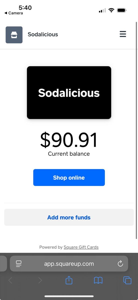 VenmoSelling two sodalicious gift cards worth $90.91 each. I'm willing to sell both for a total of $160 Meeting location in the Springville sodalicious so we can confirm with the store the cards have the $90.91 each. I accept cash or venmo. Please message me if you have any questions