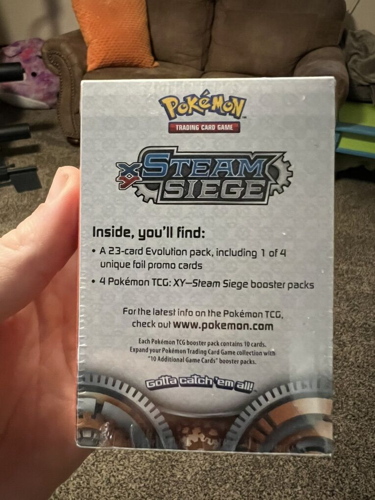 XY steam siege pre release kit with 4 booster packs, stamped promo and 23 card deck.