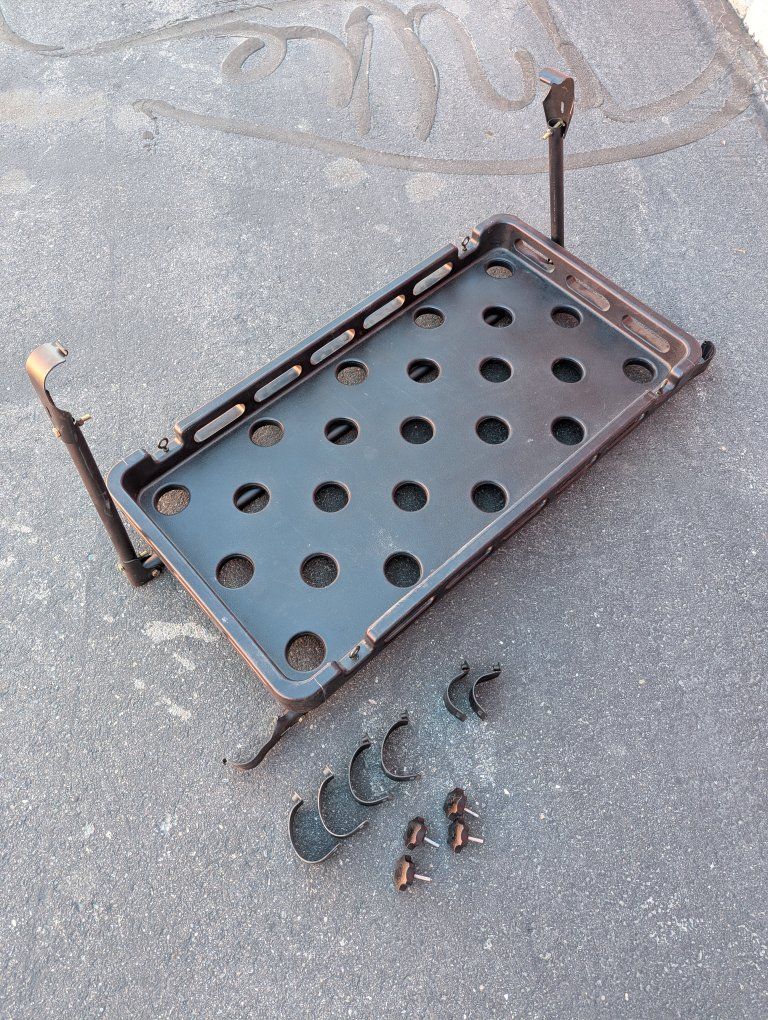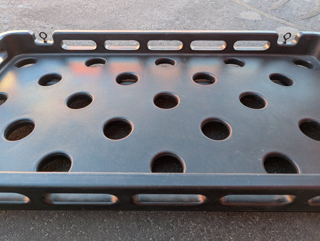 -Holds up to 75 pounds -Attaches to rear sport bar with no-drill clamps -Bracket system is metal, tray is textured plastic