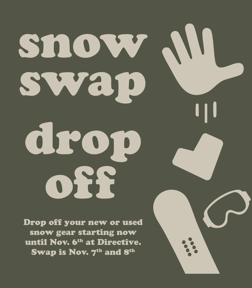 GooglePaySnowboard and snow gear swap at Directive Boardshop November 7th and 8th from 10am til 9pm.