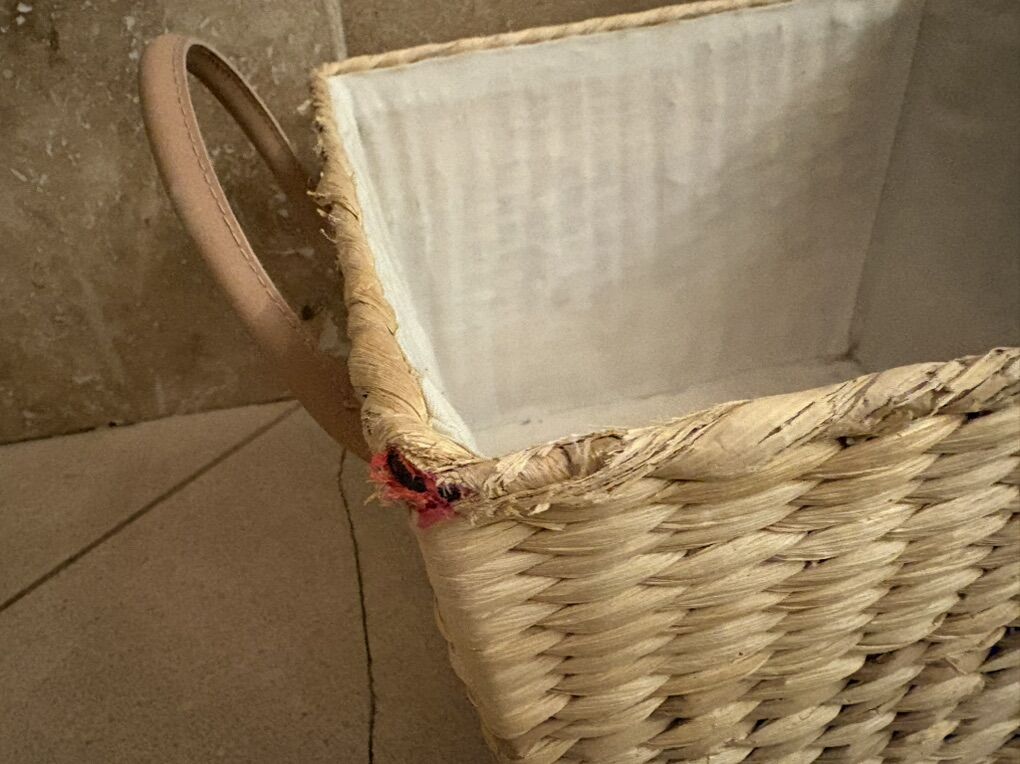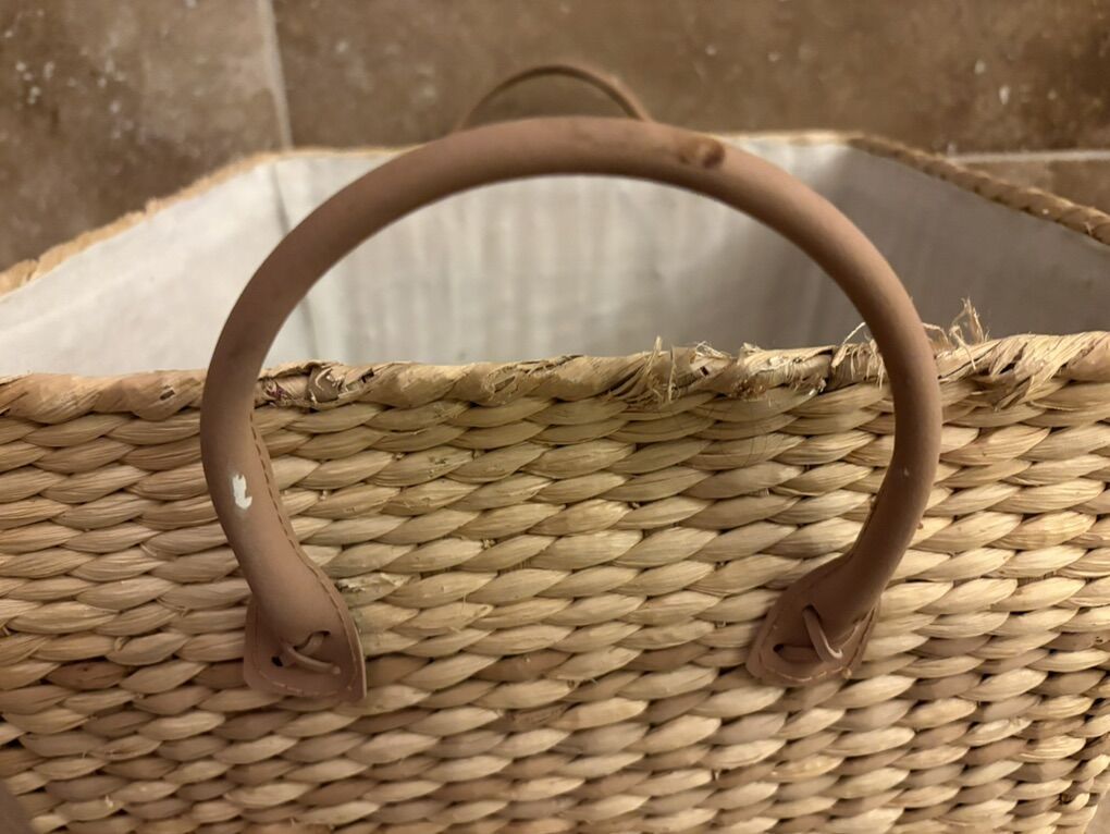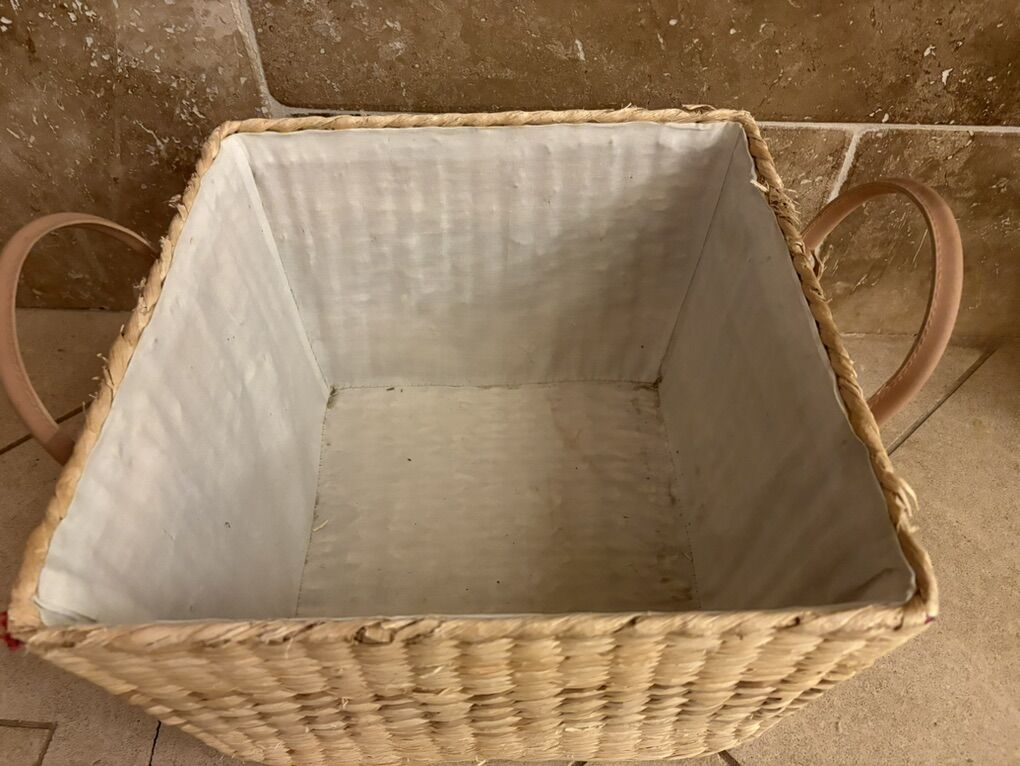 I have a square basket with 2 handles. It is 13 3/4 inches across and 9 inches tall not counting the handles. It has a white liner inside but the liner doesn’t come out. It’s a little dirty. The sides of the basket is in great shape but there’s some wear on the corners (see the closeup picture). It has faux leather handles but they have some worn spots (see the last picture). See my other ads for jewelry, artwork, home decor and more.