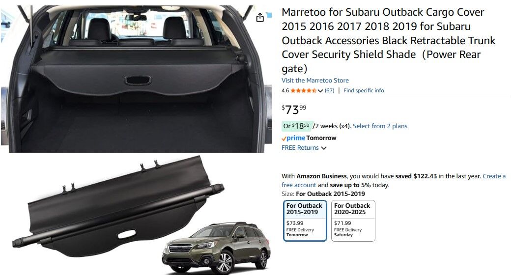 ApplePaySubaru Outback Cargo Cover 2015 2016 2017 2018 2019 for Subaru Outback Accessories Black Retractable Trunk Cover Security Shield Shade(Power Rear gate)