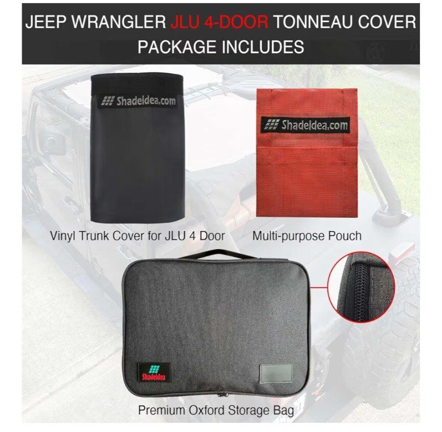The Shadeidea premium tonneau cover installs in minutes utilizing the tub rails built into your 4 Door Jeep Wrangler JLU. No tools or additional hardware is required for installation.