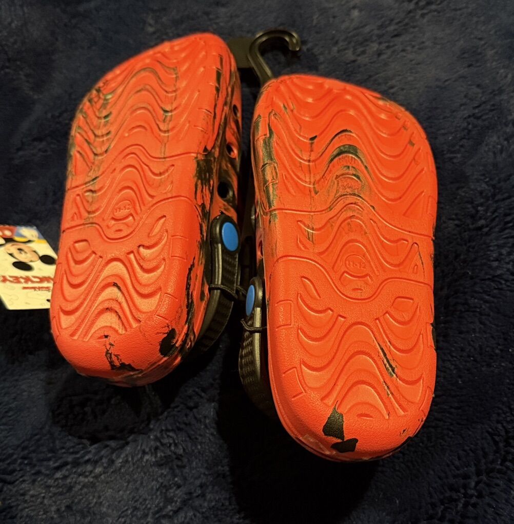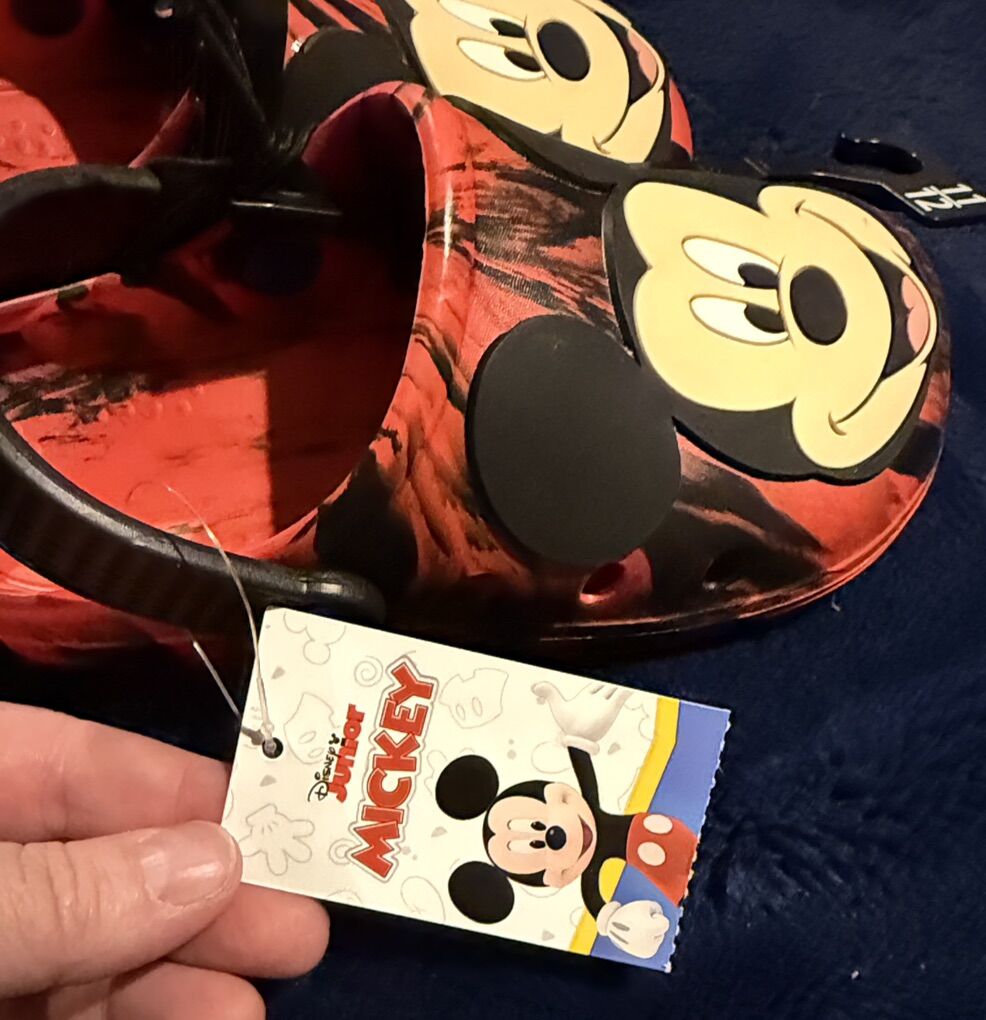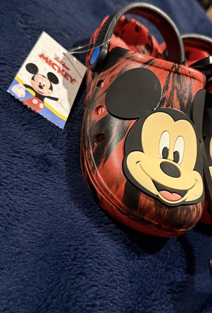 VenmoFun red clogs featuring Mickey Mouse design. Perfect for casual wear. Size 11-12 Red/black with Mickey on toe area also blue he he for back strap Plastic