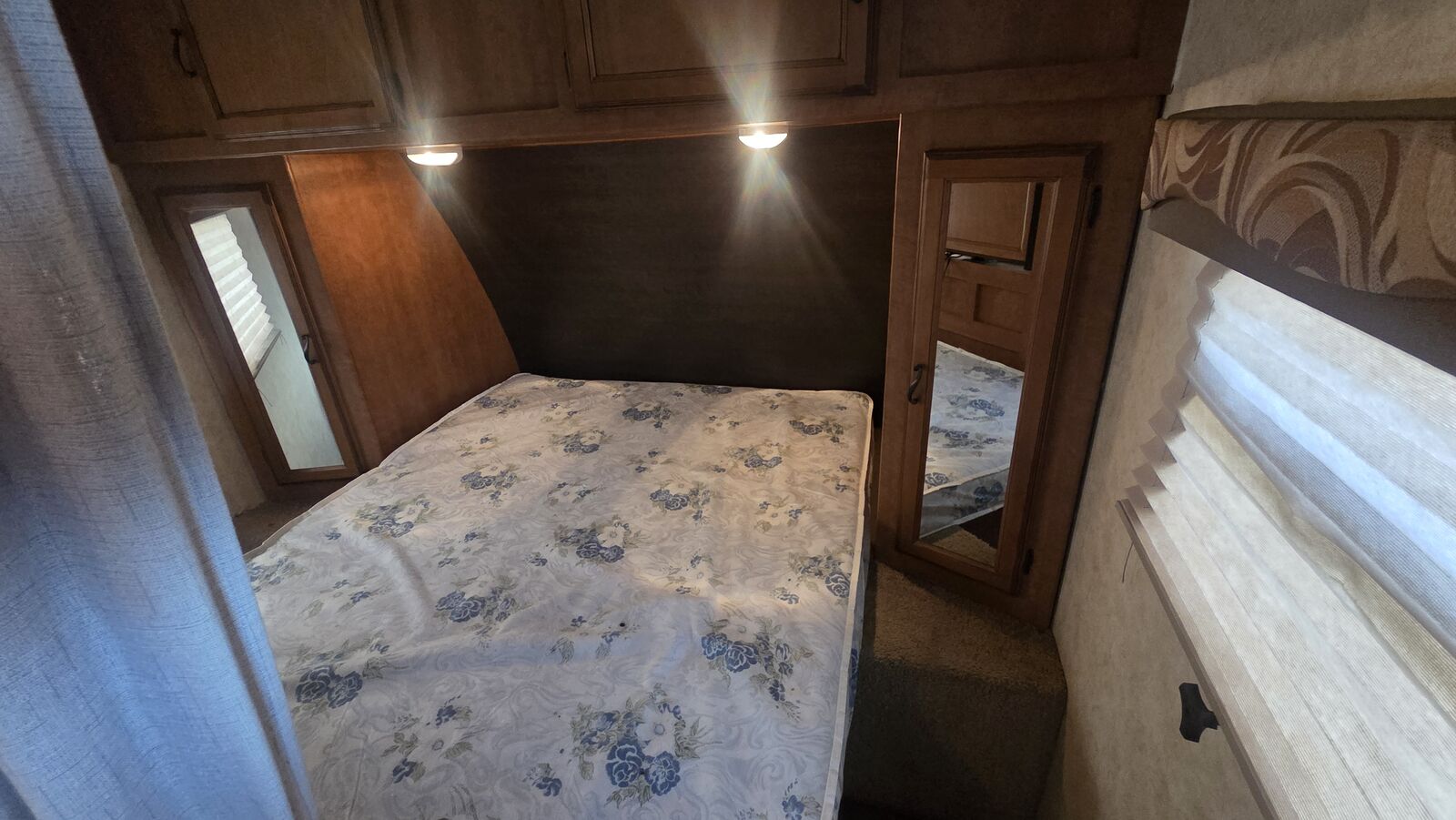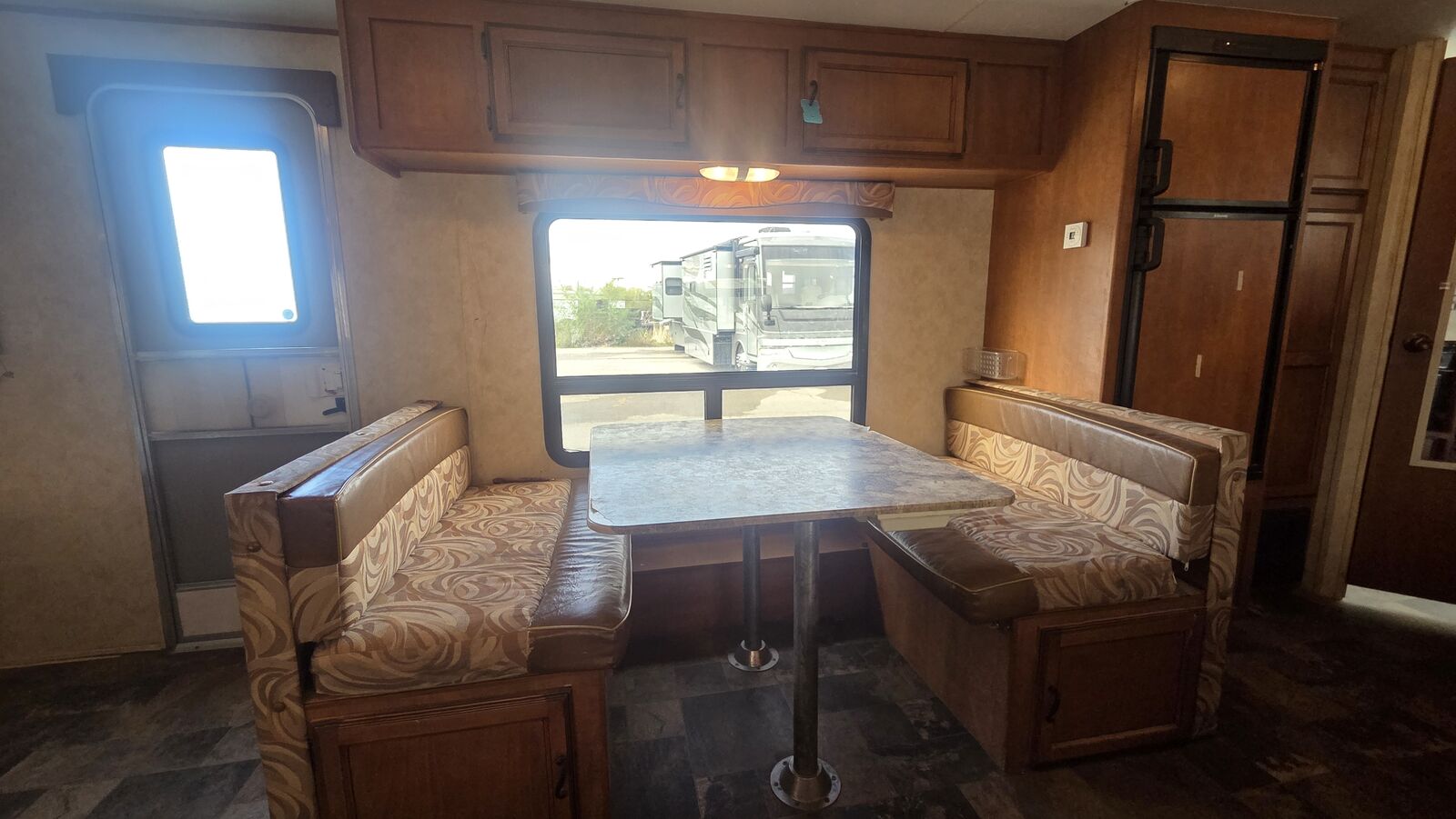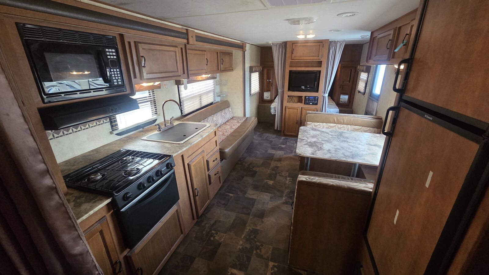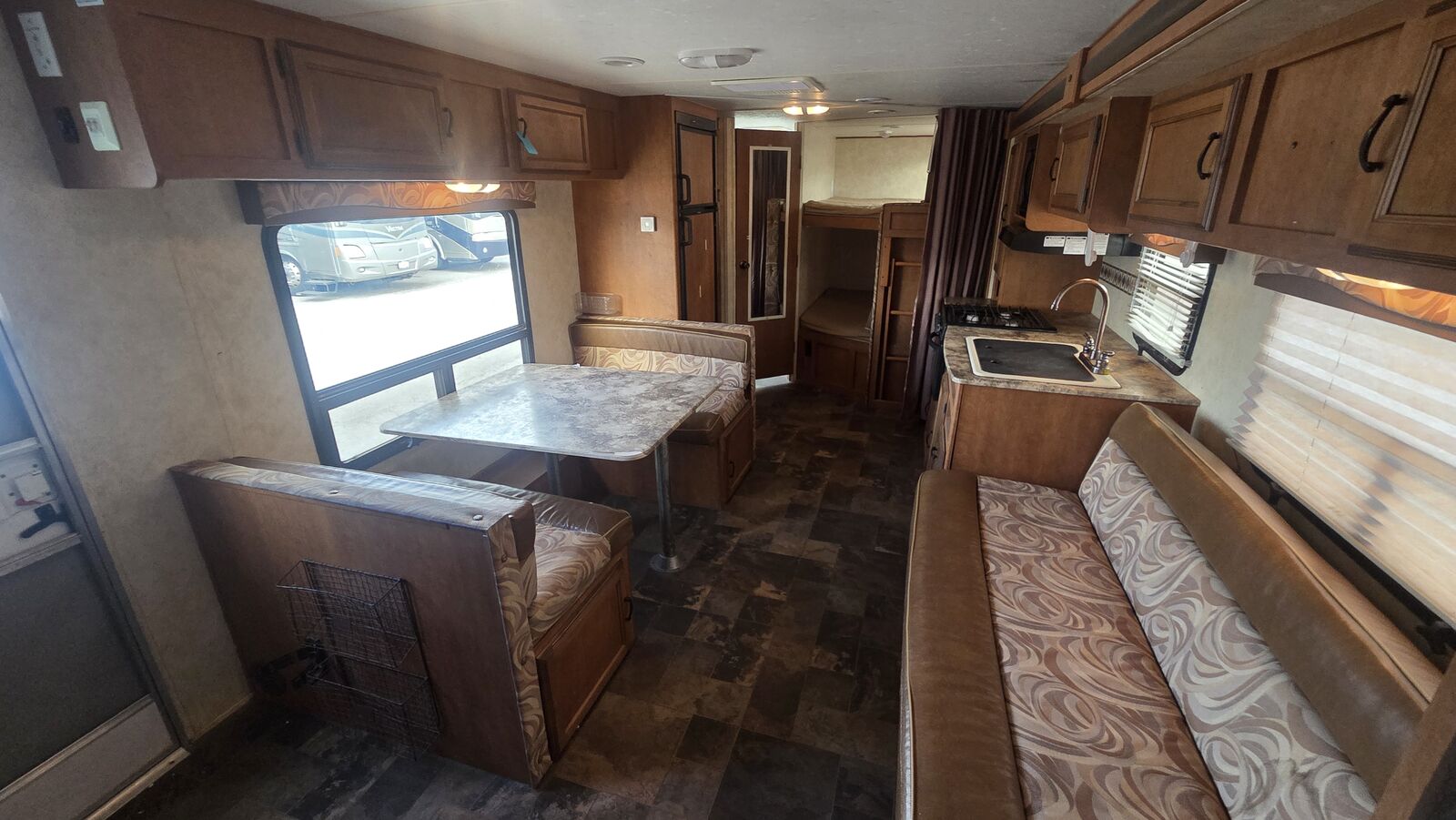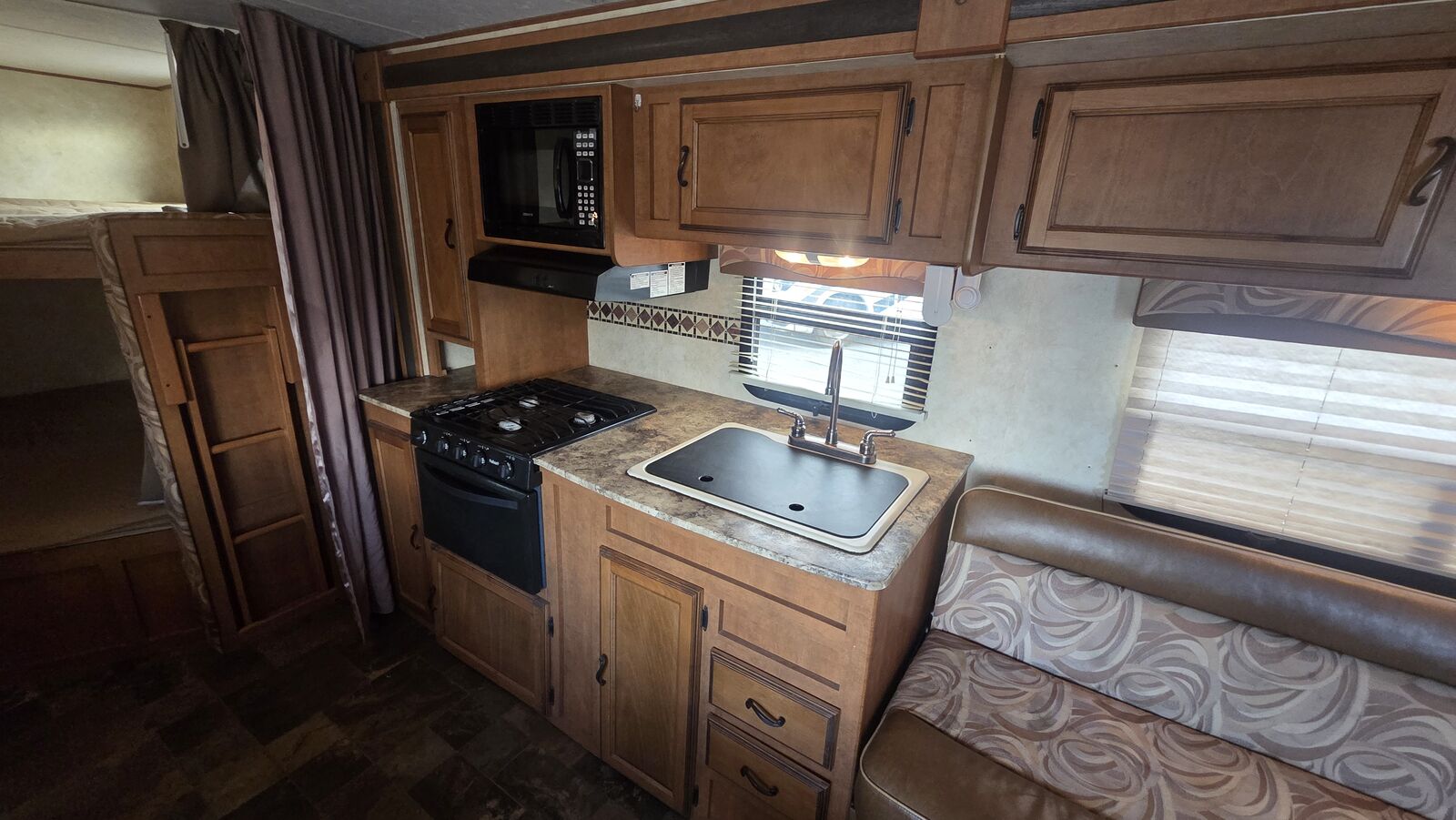 Unit Features / Upgrades: • Rear double-over-double bunks • No main patio awning (unit does not include awning) • Front queen bedroom with dual wardrobes • Booth dinette and sofa for additional sleeping • Full kitchen with 3-burner range, oven, microwave, and refrigerator • Pass-through front storage • Ultra-lite laminated construction for easier towing