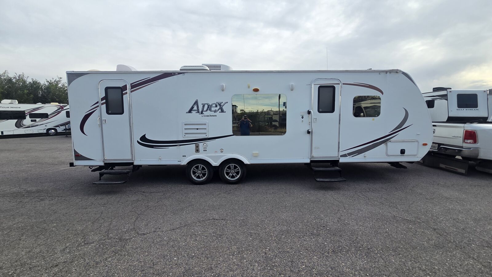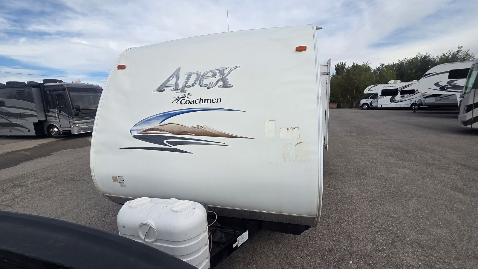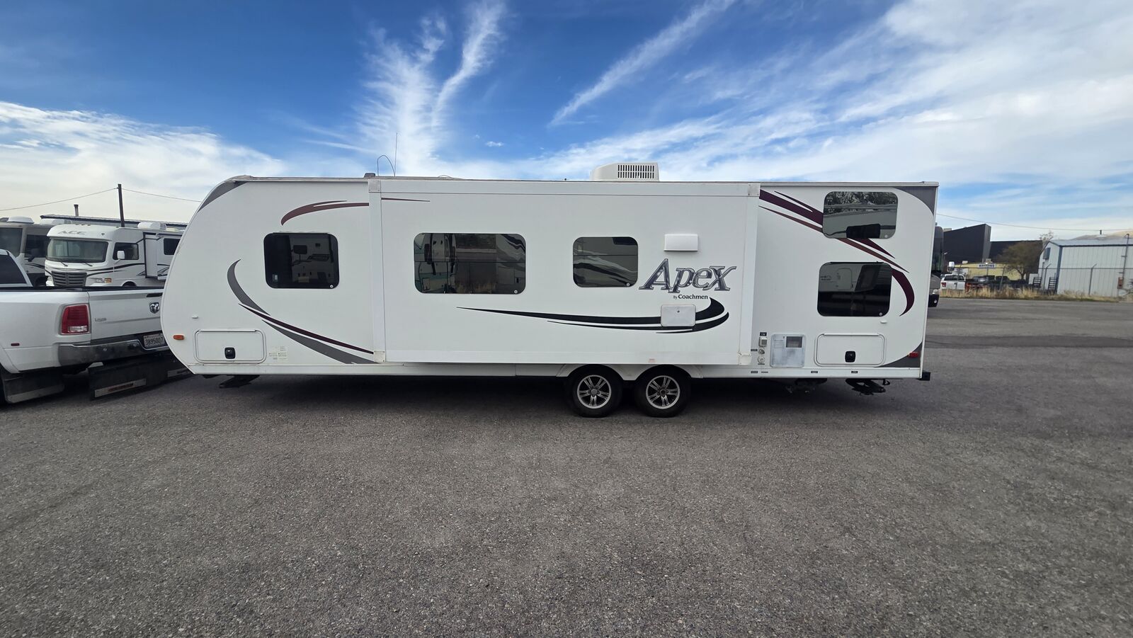 This 2013 Coachmen Apex 288BHS is an ultra-lite bunkhouse travel trailer built with laminated Azdel construction and a family-friendly layout. The 288BHS features a rear double-over-double bunk area, large slide-out, private front queen bedroom, and a full bathroom with tub/shower.
