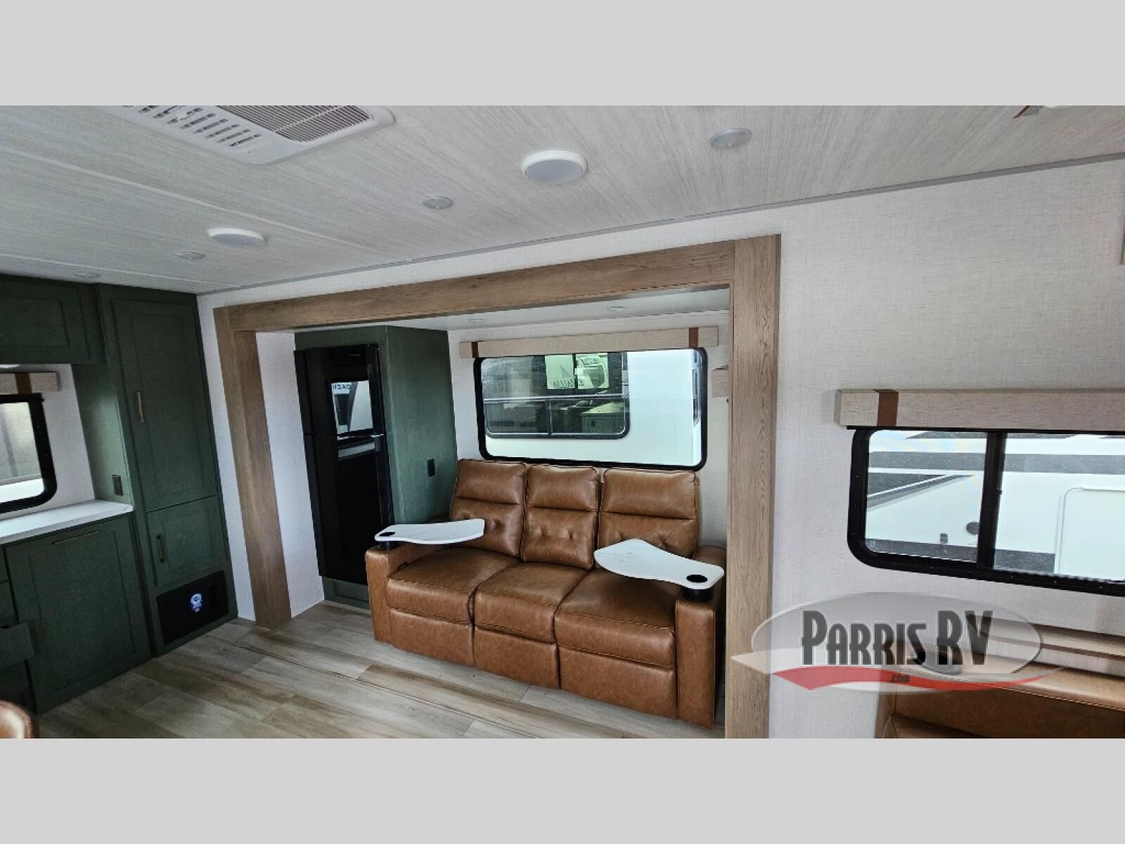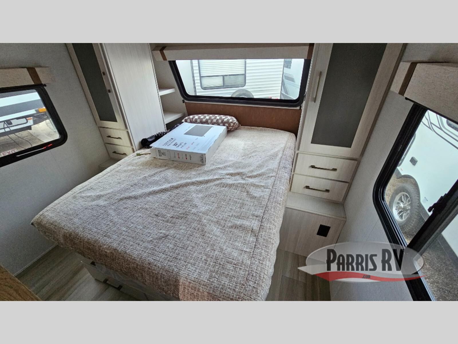 This spacious travel trailer is perfect for weekend trips to the lake. After you've unloaded the pass-through storage and put out the 20' awning, you can make lunch on the outside kitchen. If the weather isn't cooperating, the rear kitchen inside provides all the appliances needed to prepare meals. A Bar 2 Table provides a place to dine together, and there is a flip-up window here to let more light in! Your guests can sleep on the tri-fold sofa, while you take the queen bed in the front private bedroom. This unit also includes a closet with washer and dryer prep if you plan to add these appliances.