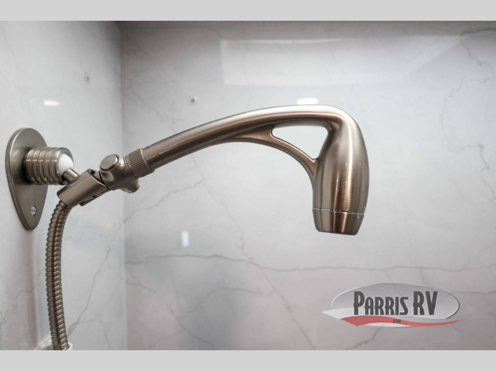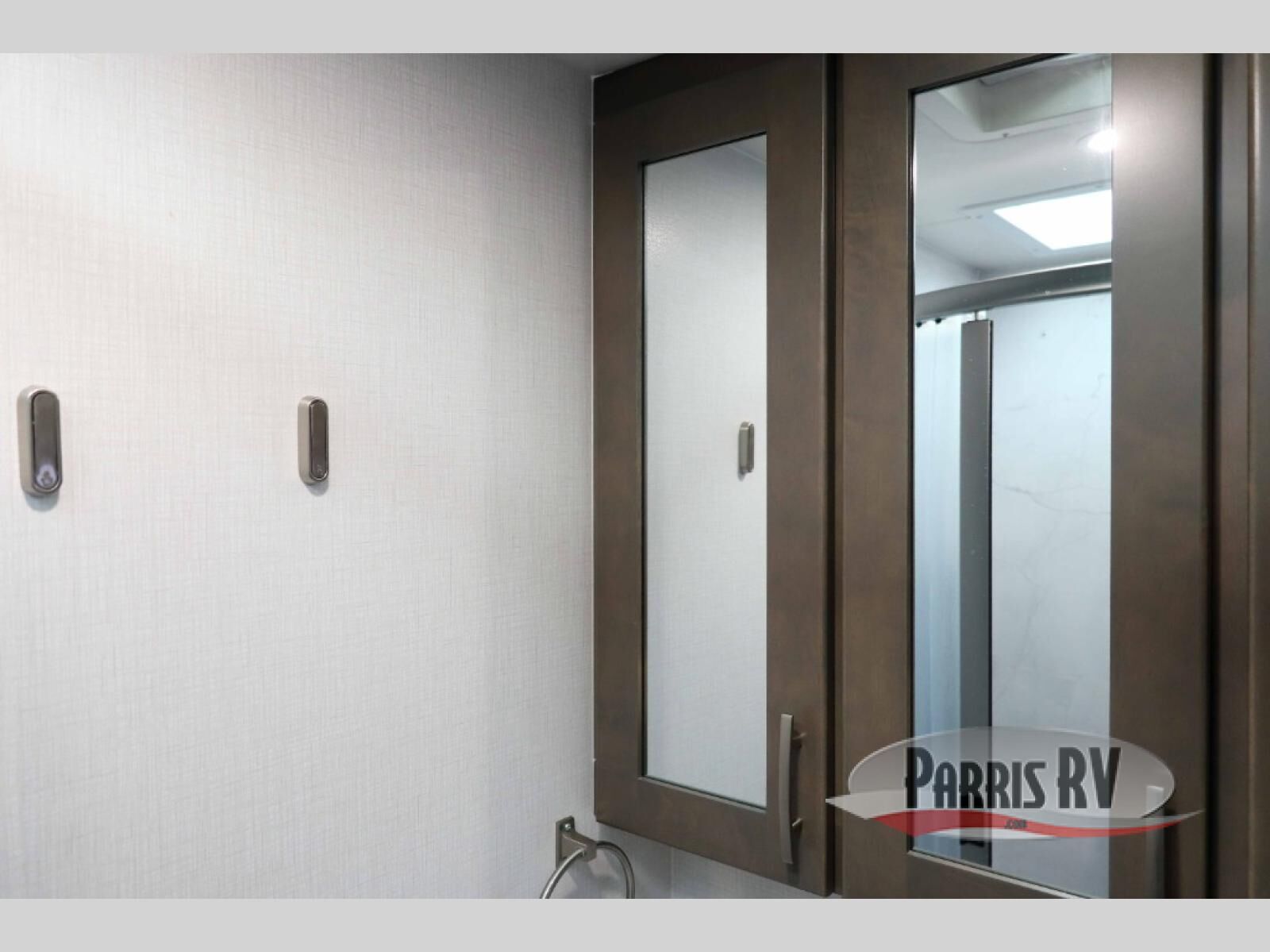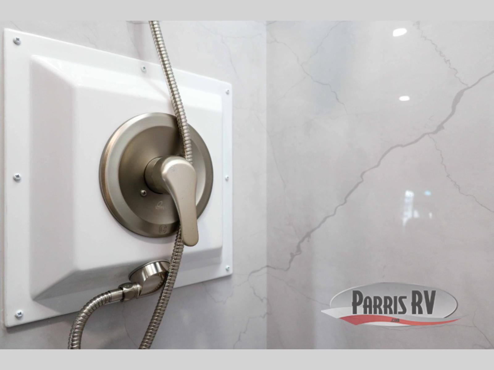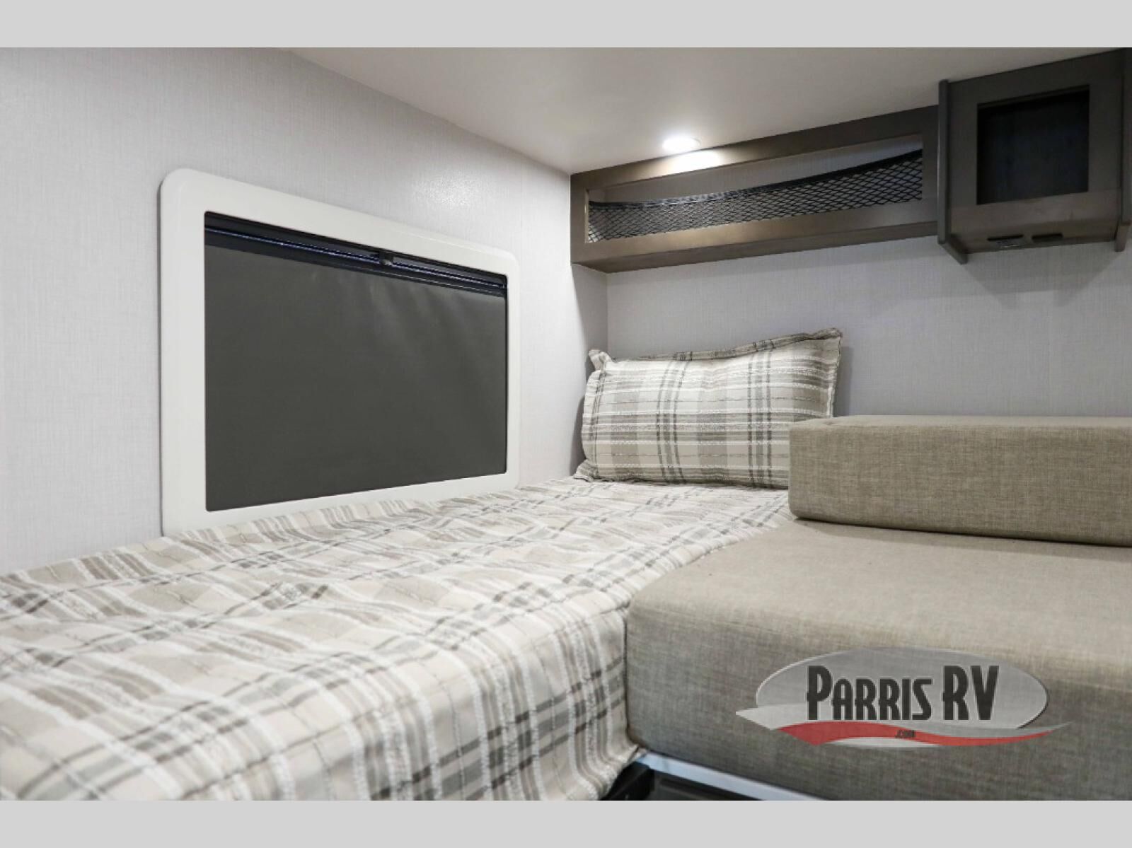 As soon as you step inside this motorhome, you're welcomed by a cozy booth dinette that perfect for enjoying meals or simply relaxing after a day on the road. Directly across, the well-equipped kitchen features all the essentials, including a 12V 8 cu. ft. refrigerator to keep your groceries fresh, a gas range with a glass cover, a convection microwave oven, and a solid surface countertop extension that adds valuable prep space. Adjacent to the dinette is the bathroom, complete with a standard shower enhanced by an Oxygenics Body Spa RV shower head and a skylight for added comfort and natural light, along with a convenient foot-flush toilet. At the rear, you'll find two 30" x 76" beds that can easily convert into an oversized king bed, offering flexible sleeping arrangements. To top it all off, a 32" LED Smart TV lets you unwind with your favorite shows, making this motorhome a true home on wheels.