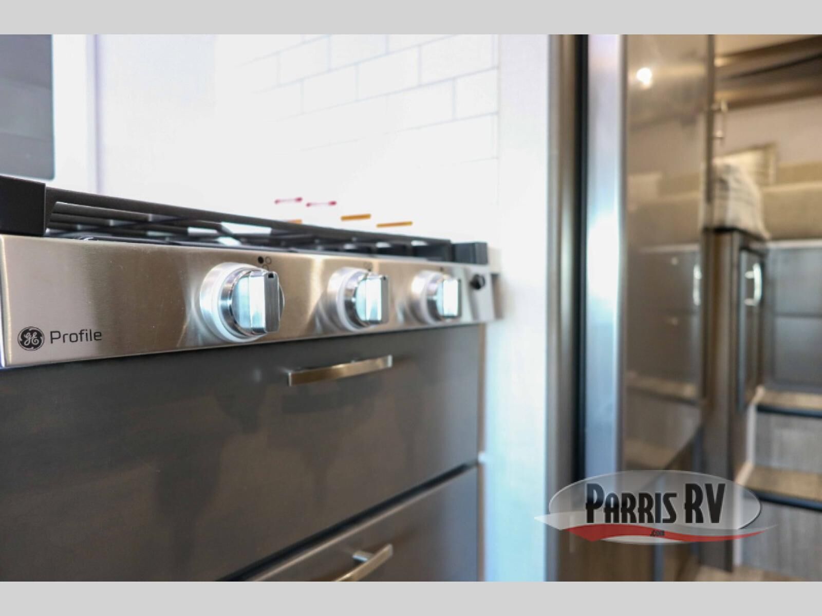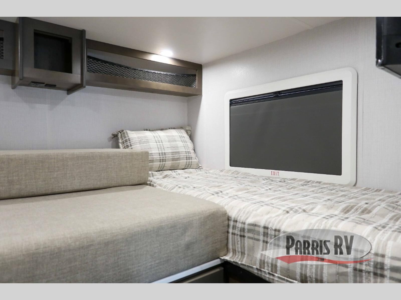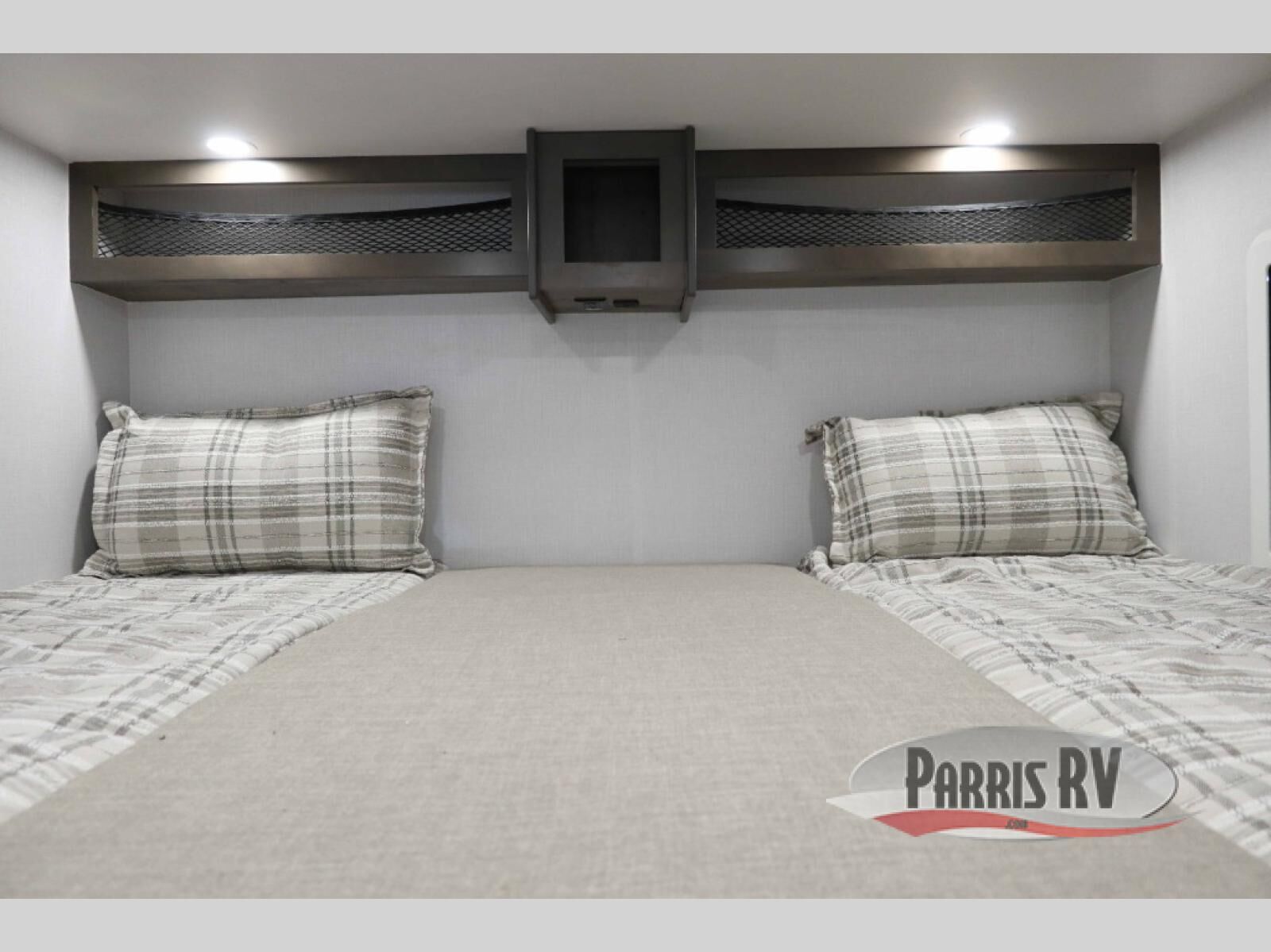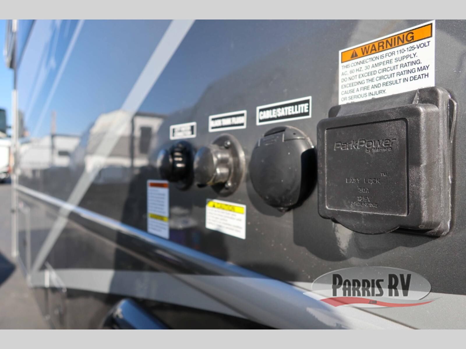 As soon as you step inside this motorhome, you're welcomed by a cozy booth dinette that perfect for enjoying meals or simply relaxing after a day on the road. Directly across, the well-equipped kitchen features all the essentials, including a 12V 8 cu. ft. refrigerator to keep your groceries fresh, a gas range with a glass cover, a convection microwave oven, and a solid surface countertop extension that adds valuable prep space. Adjacent to the dinette is the bathroom, complete with a standard shower enhanced by an Oxygenics Body Spa RV shower head and a skylight for added comfort and natural light, along with a convenient foot-flush toilet. At the rear, you'll find two 30" x 76" beds that can easily convert into an oversized king bed, offering flexible sleeping arrangements. To top it all off, a 32" LED Smart TV lets you unwind with your favorite shows, making this motorhome a true home on wheels.