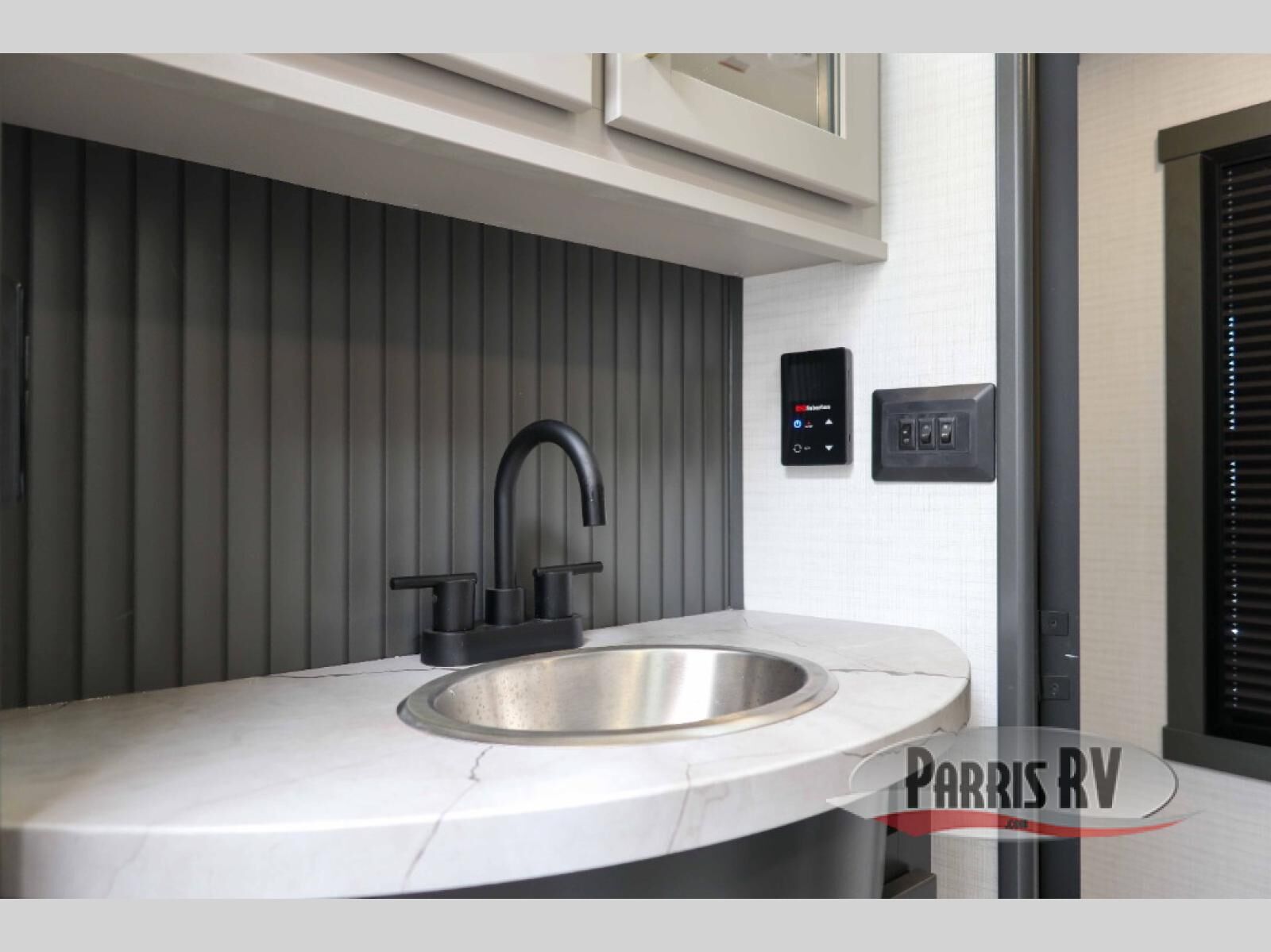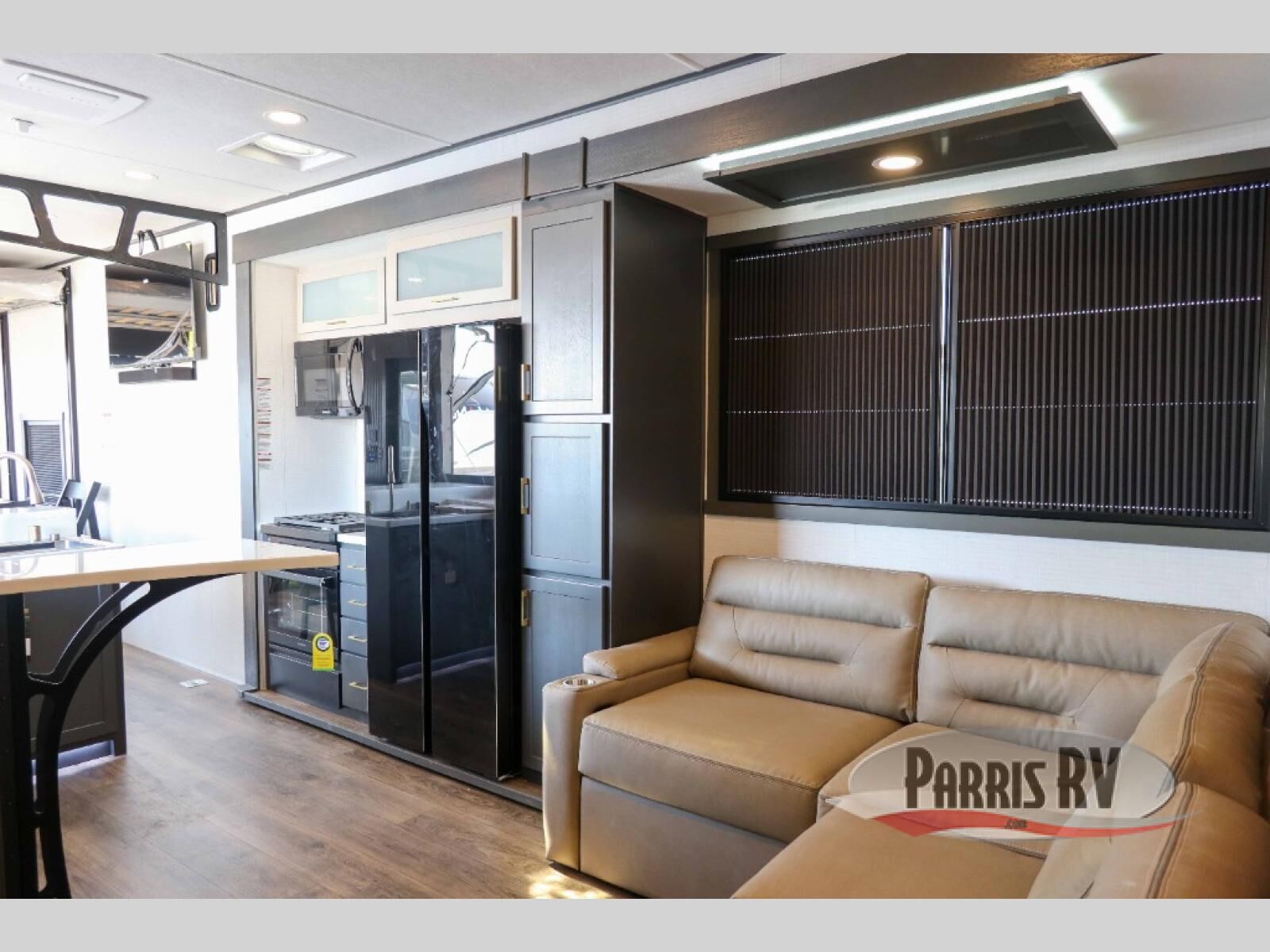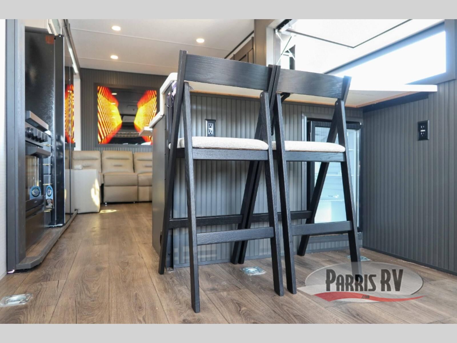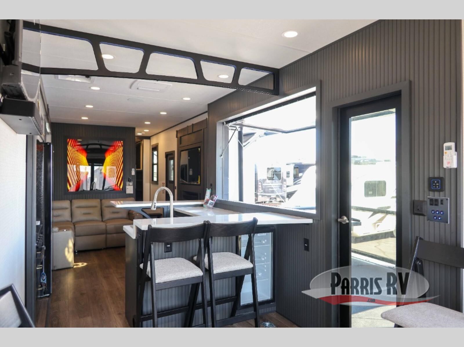 It's easy to see why this model was voted 2025 Top Innovation by RV Business! Once you arrive at your destination, you can unload your toys from the 13' garage, then relax on the dual gaucho sofas with a removable dinette table in between. There is also a queen-size Euro bed above the sofa where guests can sleep. Everyone will love to visit on the side patio that features a flip-down bar top and a window that looks into the kitchen. There are also bar stools here and inside at the counter so everyone has a seat. If the weather isn't cooperating, you can relax on the L-shaped sofa in the main living area, and there is a 55" TV with a hidden pantry behind for snacks! A spacious full bath will let everyone freshen up after trail riding, and you'll love having your own bedroom up front. Here, you'll find a king bed slide out, a wardrobe, dresser, plus washer and dryer prep if you choose to add those appliances!