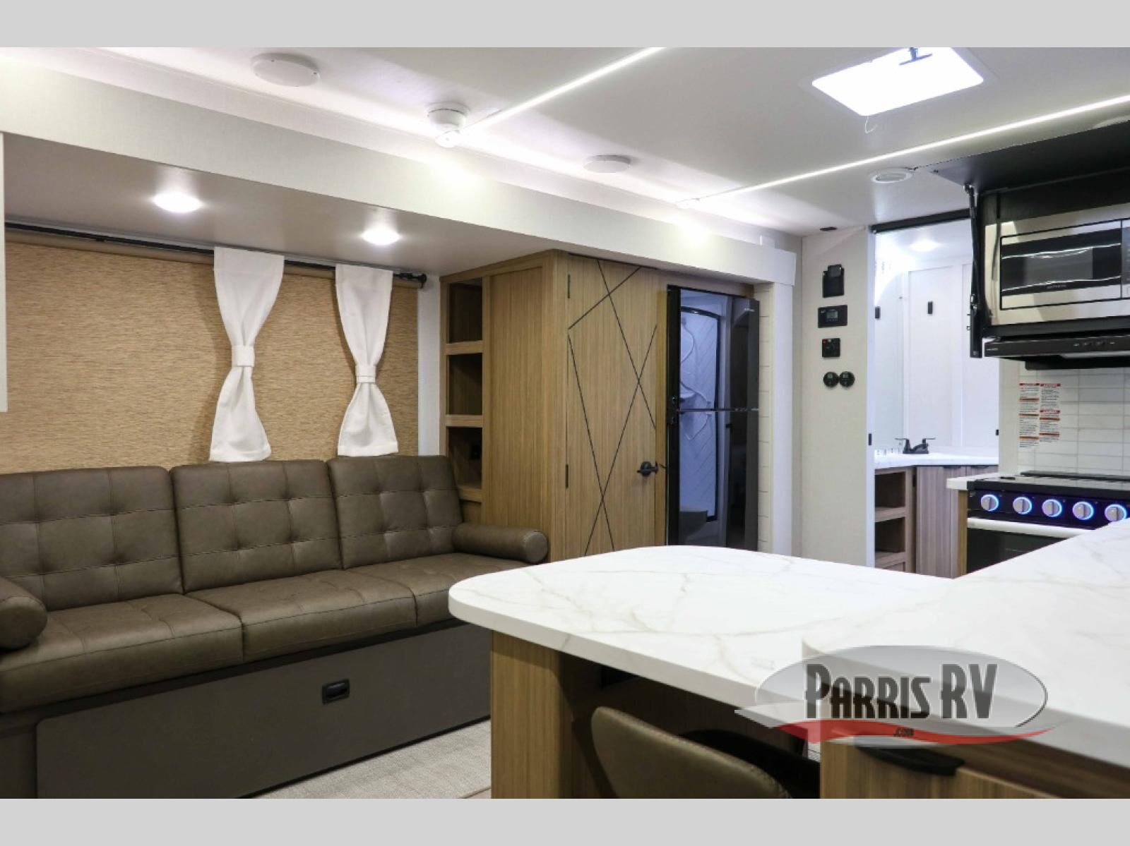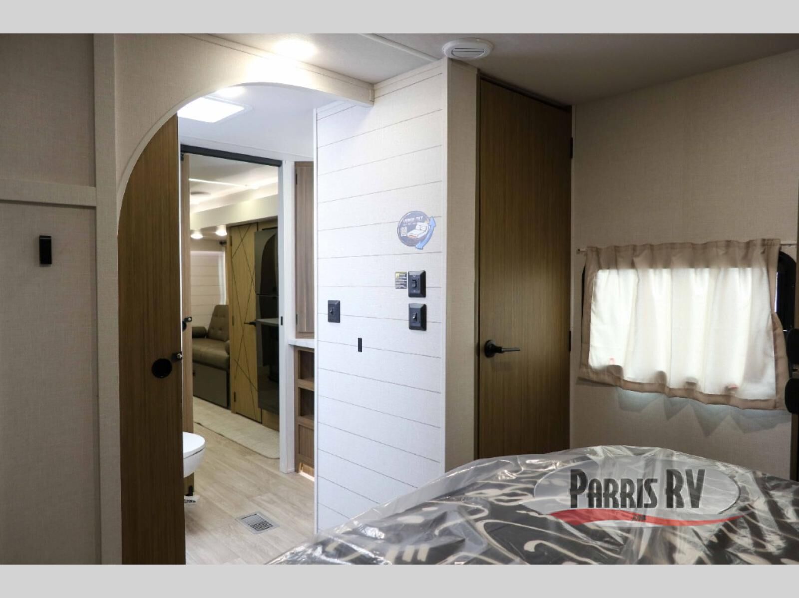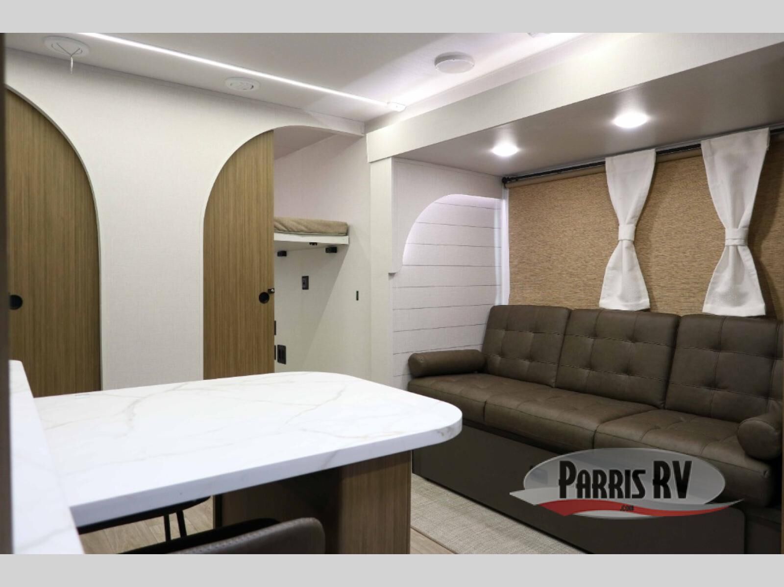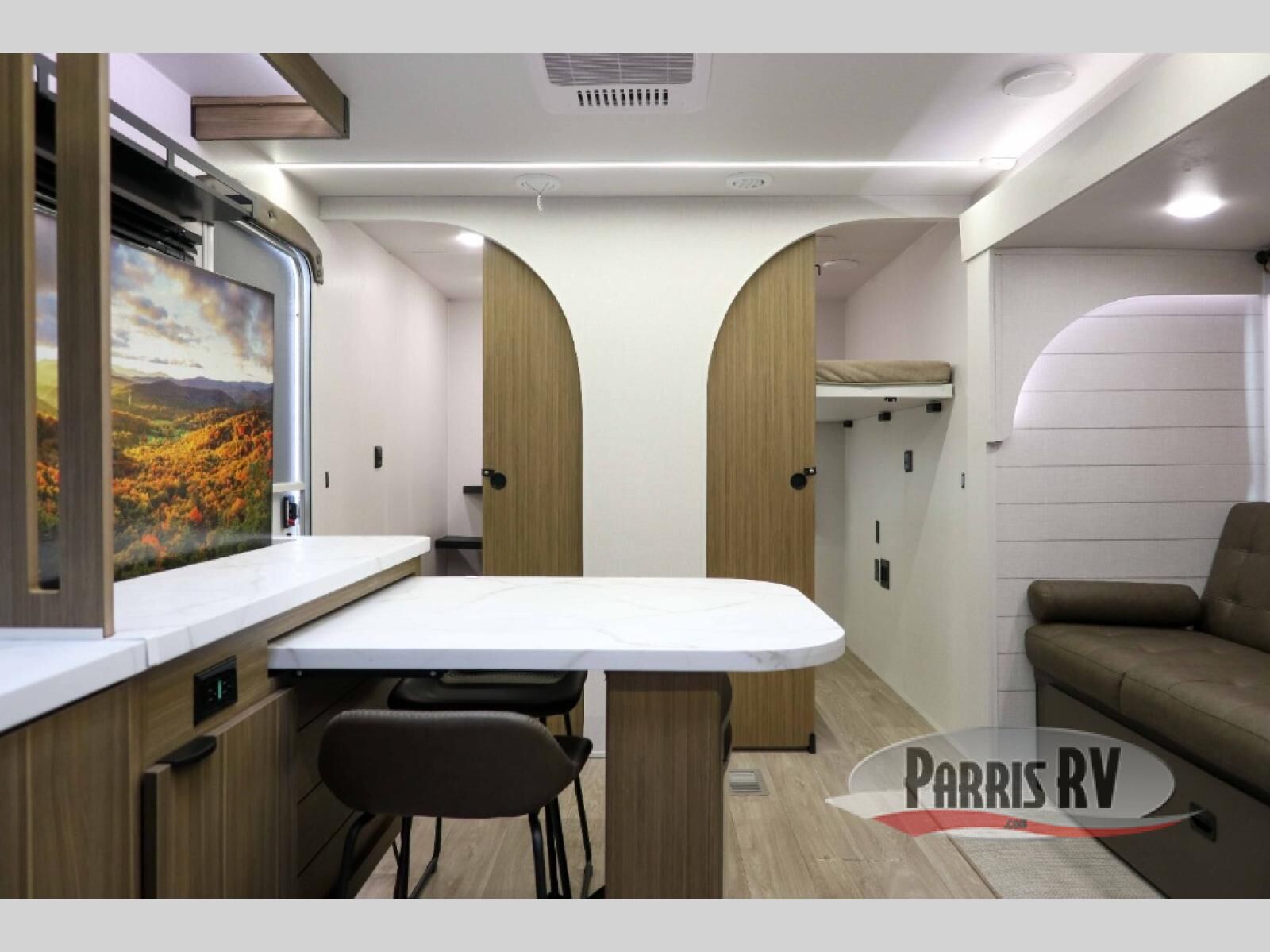 Everyone will enjoy having their own space in this travel trailer thanks to the front master bedroom and the rear bunkhouse. The bunkhouse includes a wall to separate the Versa bunk and fold-down desk on one side and a Versa sofa on the other, perfect for older kids or guests. You'll have the custom king bed with Versa Tilt all to yourselves, and the walk-thru bath will be easily accessible for everyone. In the combined kitchen and living room, a jackknife sofa slide sits across from the fireplace/entertainment center, and there is a pull-out table here so you can dine together.