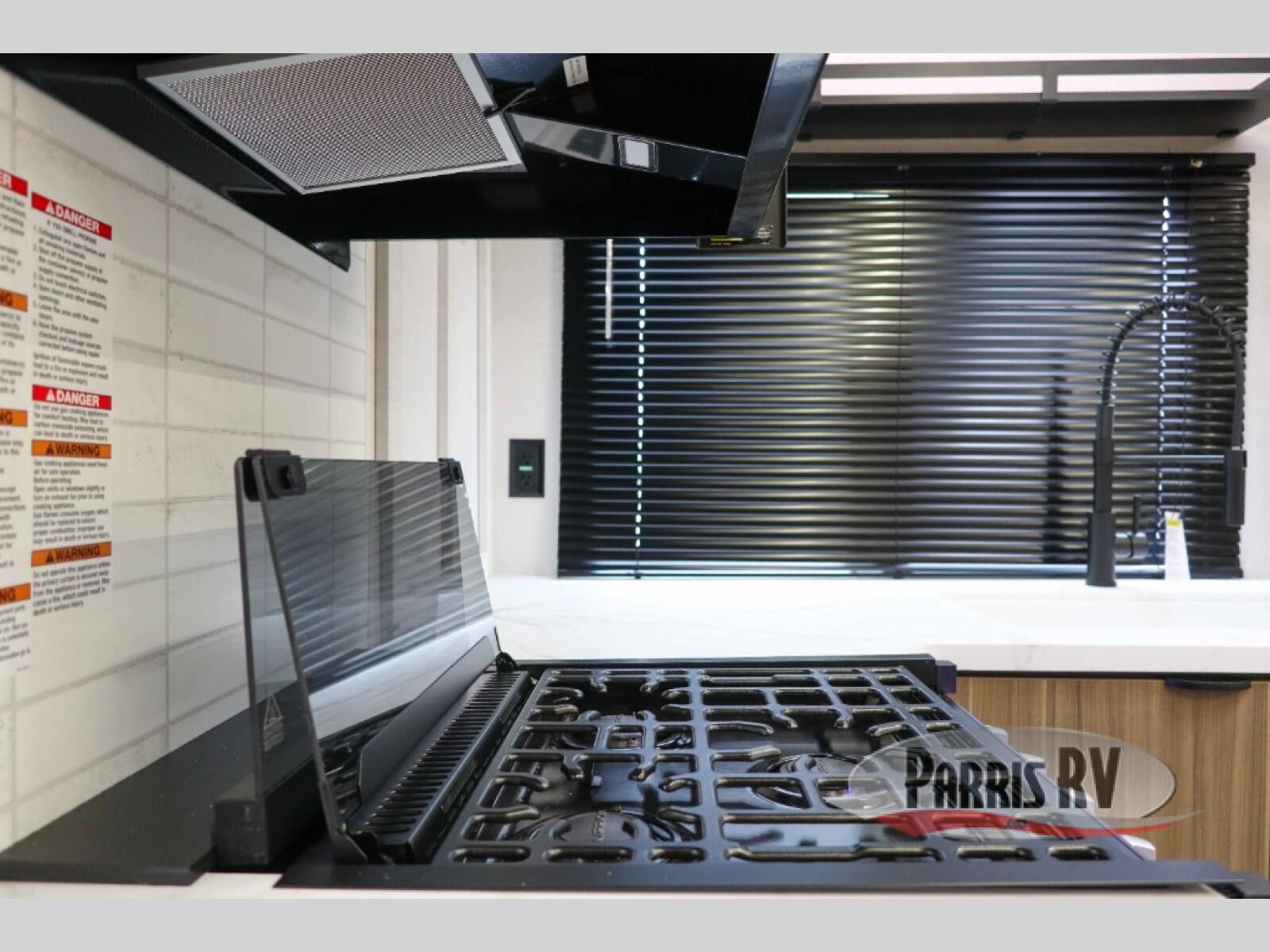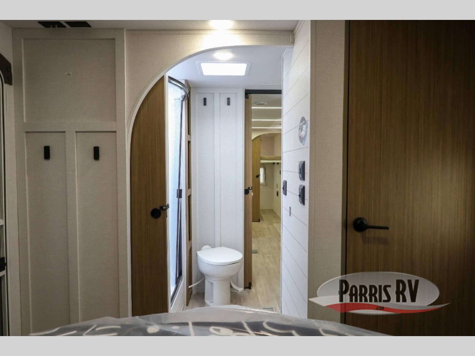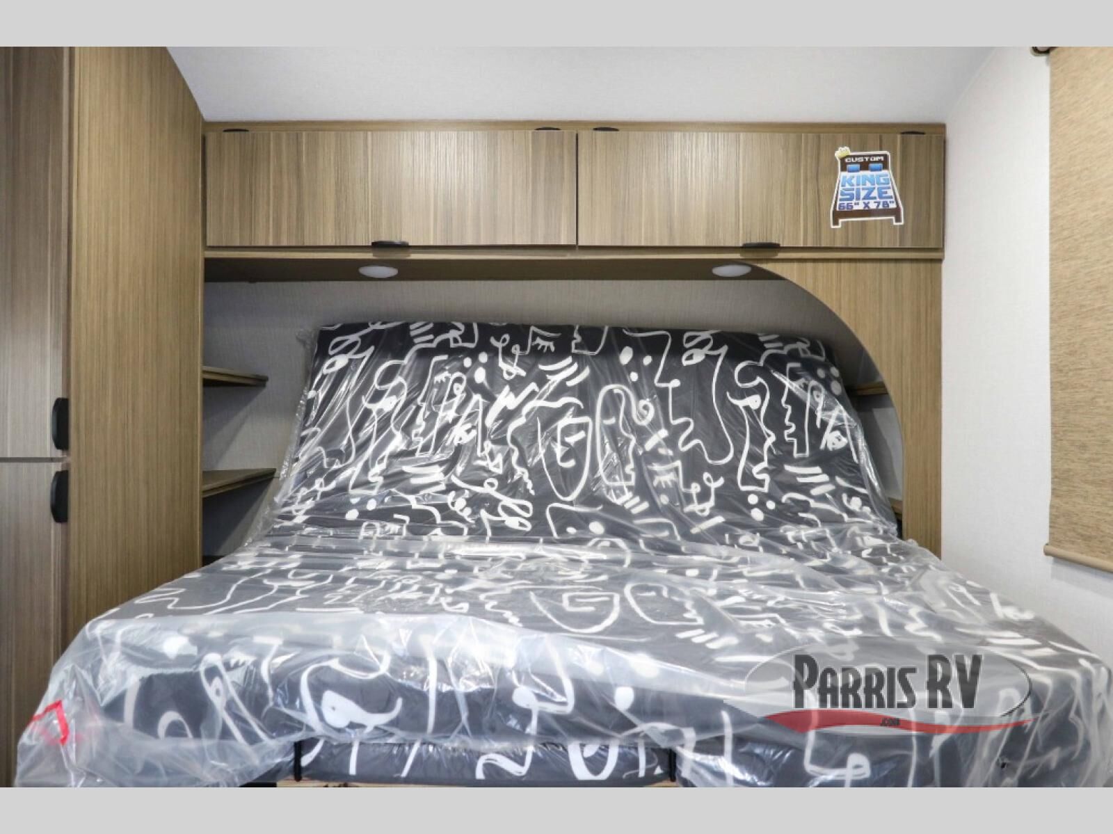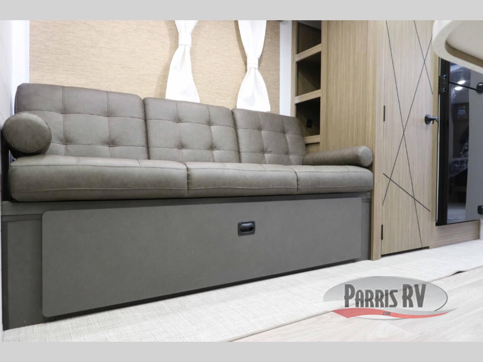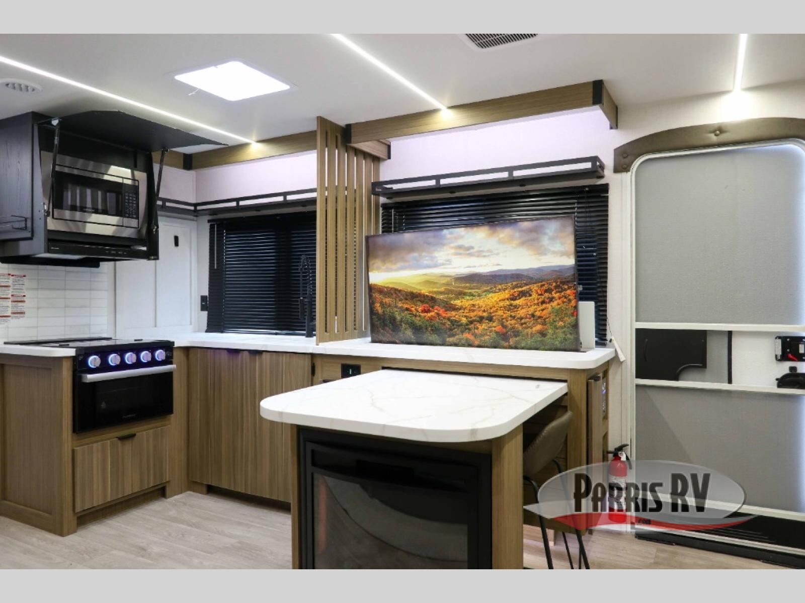 Everyone will enjoy having their own space in this travel trailer thanks to the front master bedroom and the rear bunkhouse. The bunkhouse includes a wall to separate the Versa bunk and fold-down desk on one side and a Versa sofa on the other, perfect for older kids or guests. You'll have the custom king bed with Versa Tilt all to yourselves, and the walk-thru bath will be easily accessible for everyone. In the combined kitchen and living room, a jackknife sofa slide sits across from the fireplace/entertainment center, and there is a pull-out table here so you can dine together.