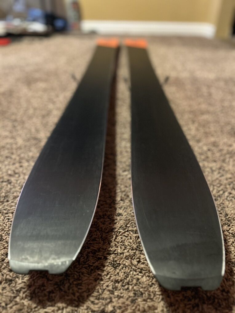 Skis and bindings are in great condition with light use — roughly a dozen days total. Bases are clean, edges sharp, and only a few small cosmetic top-sheet scratches. Stored indoors and waxed regularly.