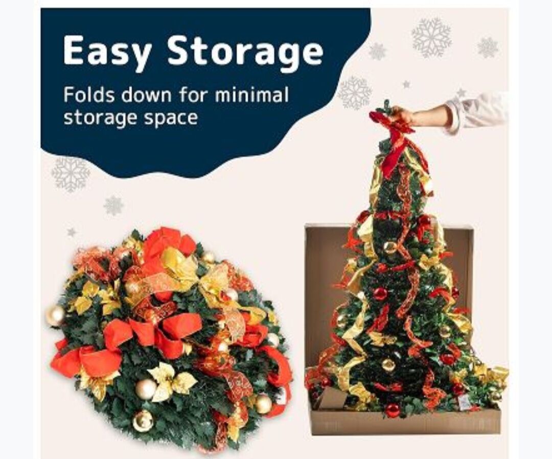 Premium 6 ft Pre-Decorated Christmas Tree with 350 Warm Lights, Gold and Red Color, Polyvinyl Chloride Material, Lighted Christmas Tree