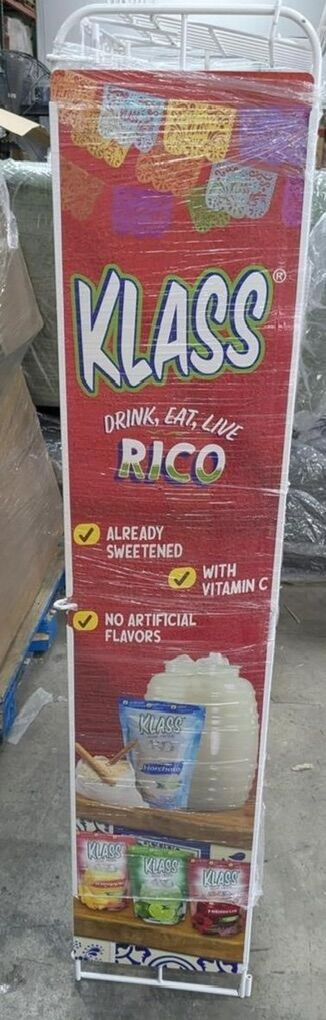 This Klass Display Rack is a versatile and eye-catching addition to any retail space. Measuring 5 feet tall, 1 foot wide, and 1 foot deep, it features a sturdy white metal frame designed to hold various products. The display is adorned with vibrant graphics promoting Klass beverages, emphasizing their refreshing qualities and natural ingredients. Ideal for showcasing drinks, snacks, or other merchandise, this rack is perfect for maximizing visibility and attracting customer attention. Its compact design allows for easy placement in any store layout.