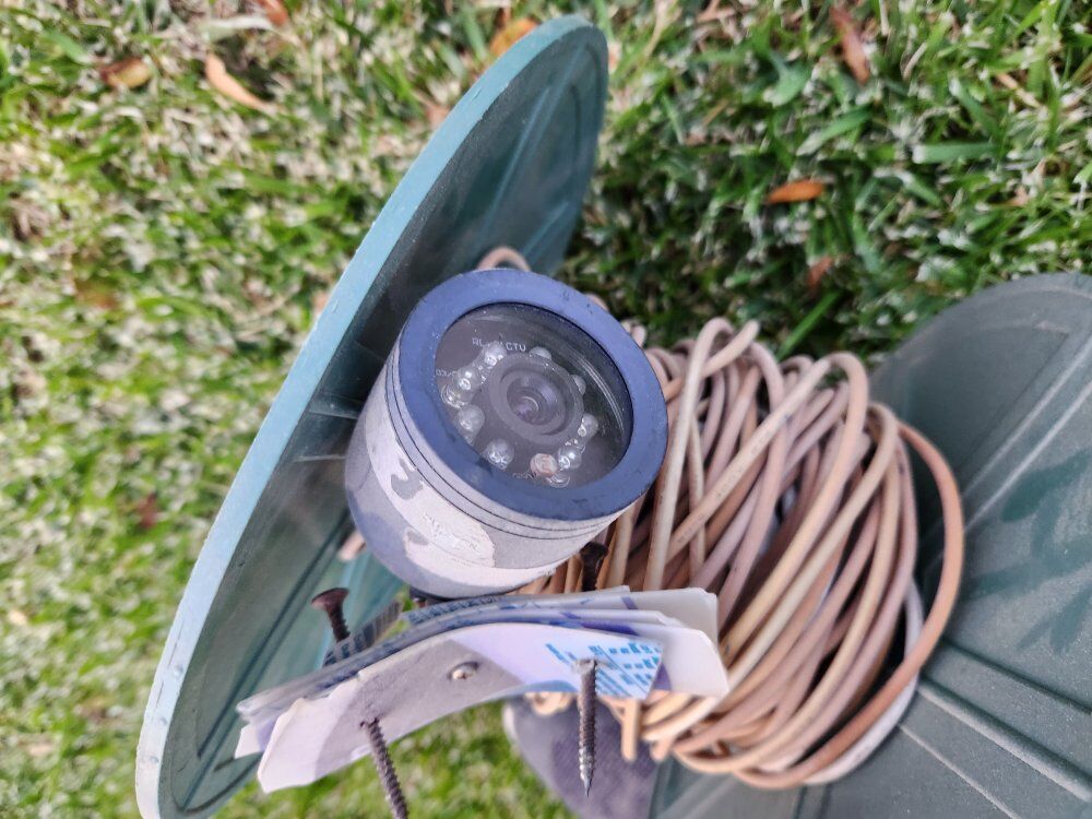camera with very long cable. connects to TV with audio visual inputs. tested and is still working great.