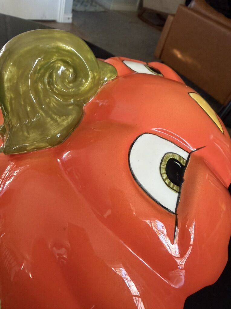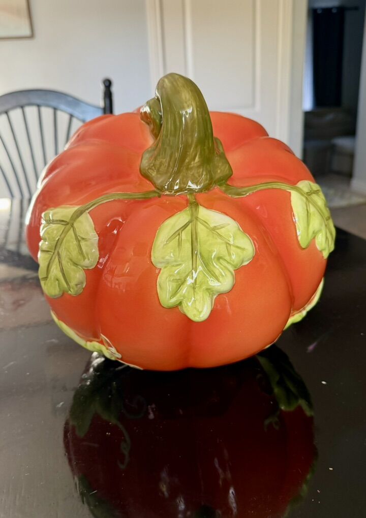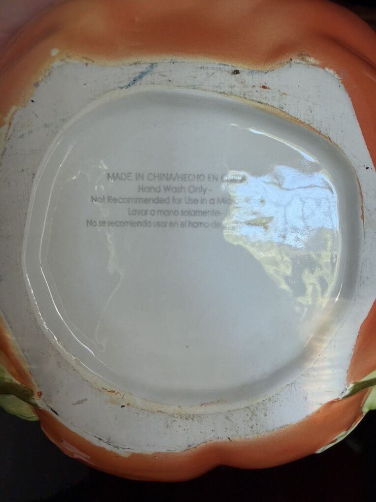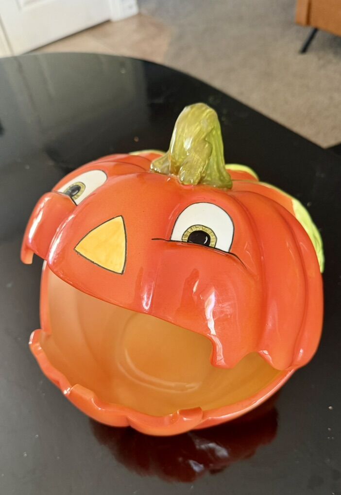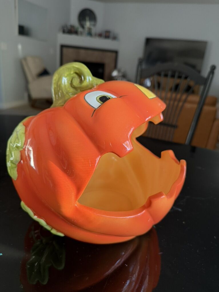 CashAppAdorably spooky ceramic Jack o lantern big mouthed candy bowl in excellent condition! Orange in color with green stem and leaves, and inside of mouth/bowl is yellow. Perfect Halloween bowl for handing out candy to trick or treaters. Is very large in size, measures about 10 inches wide, long, and tall and has plenty of room for lots of candy! Could also be used as a food bowl for a Halloween potluck or party. Would work great for chips, snacks, soup or punch.