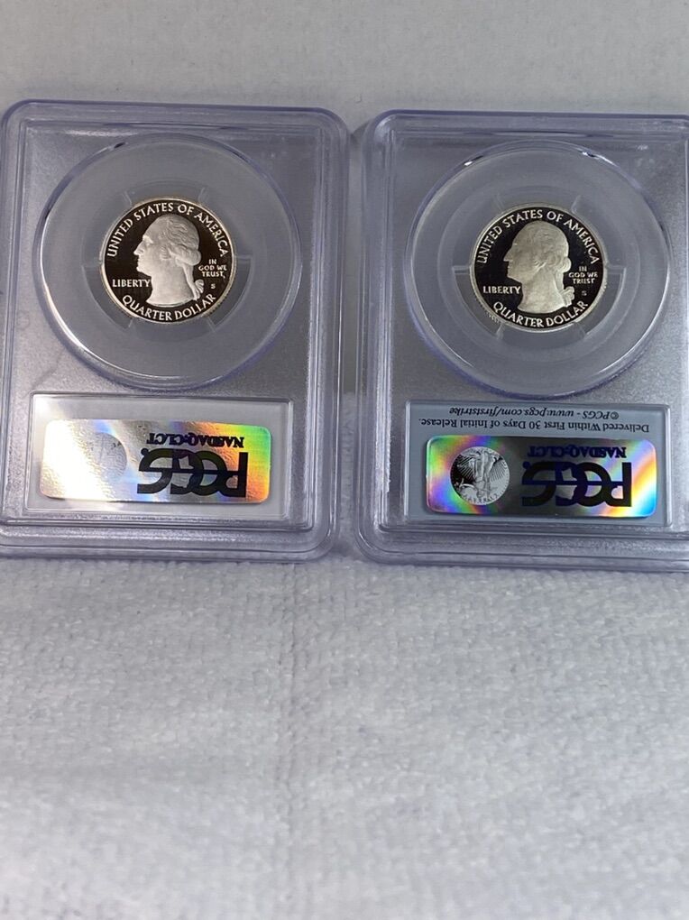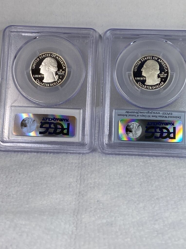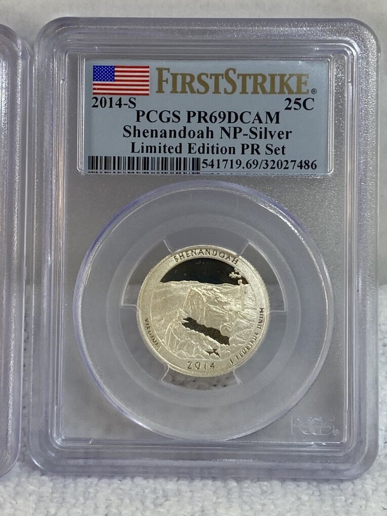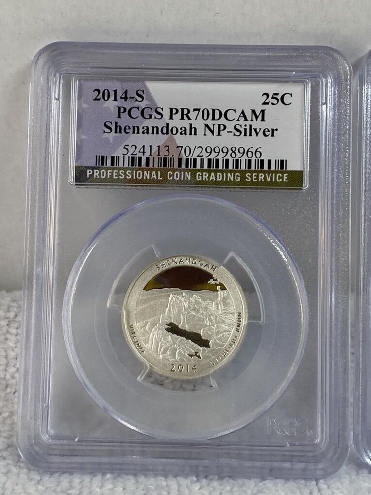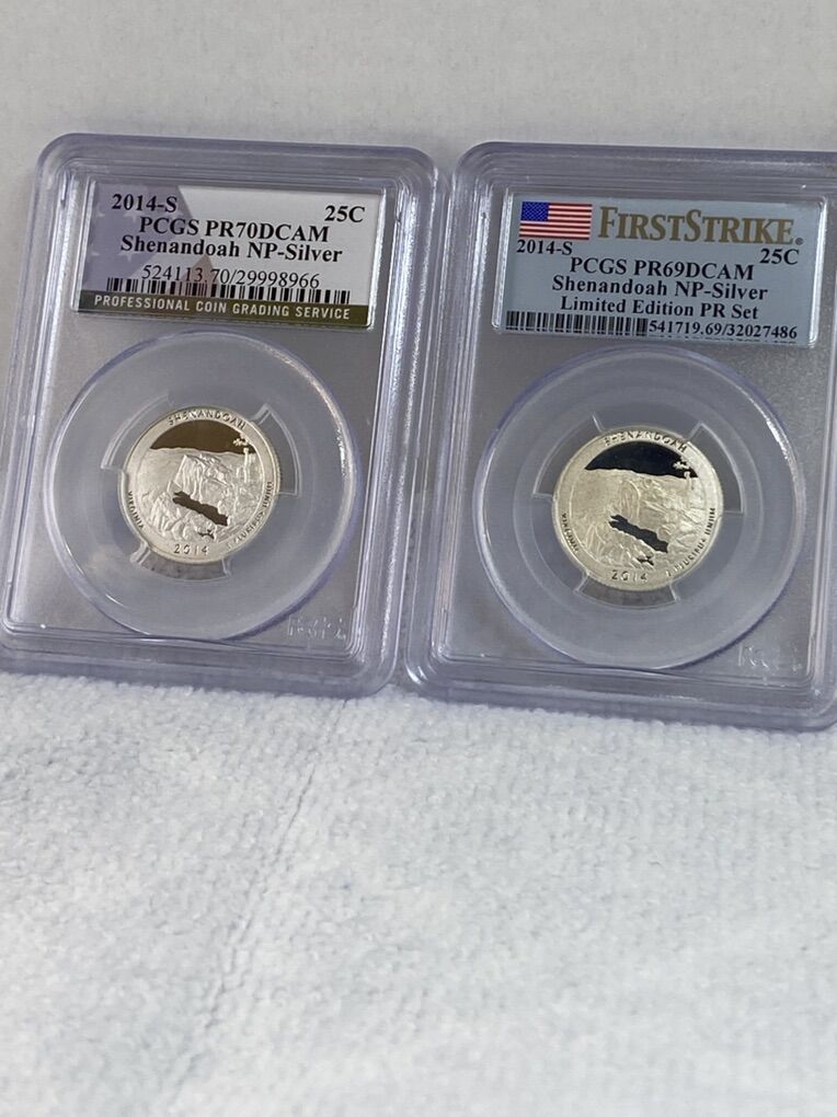 PayPalA beautiful pair of 2014 Quarters graded by PCGS and minted in San Francisco. Coins from the US Mint National Park Series these coins commemorate Shenandoah National Park. Very known for the 105 mile Skyline Drive along the crest of the Blue Ridge Mountains. The mint would issue five different quarters in the series each year both in clad and silver. Most in copper/clad form and limited amounts in 90% silver. Both of these coins are 90% Silver. Both have been graded by PCGS and the serial numbers are recorded. Shipping is available, just ask. Reference’s available, you can speak with my wife. Contact me if you have any questions or concerns.