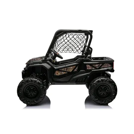 Realtree-XD 24V Powered Ride-On UTV Features including a multipurpose wheel, foot pedal acceleration, forward/reverse functions, double openable doors, and a maximum speed of 5 MPH Increased safety assurance due to spring suspension system, remote-control option, seat belt, and speed restrictions Can be controlled by both the kids and the parents Working LED lights and rear lights, engine start sound, a real horn, multi-functional dashboard, and steering wheel Has 2 comfortable seats, making it the perfect side-by-side ride for siblings or friends Spacious trunk space to haul toys, treasures, and snacks, with a shovel make it an ideal UTV for outdoor adventures Fully charged the run time for Realtree XD UTV 24V is 30-60 mins (depending on the usage of the UTV, climate, terrain, weight etc.)