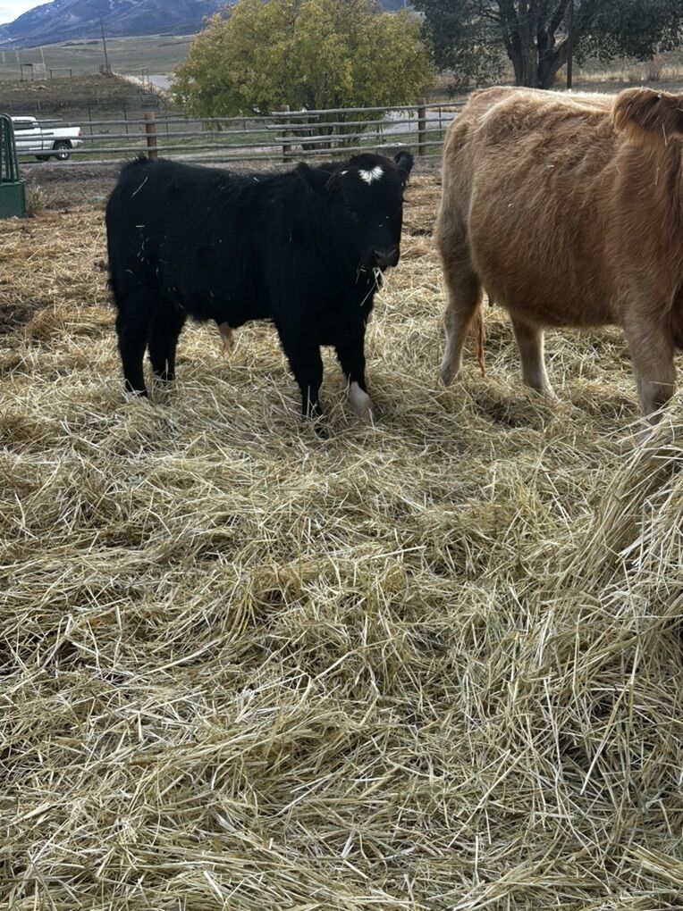 Born 4/10/25 Mini highpark cross Bull calf is outta small frame beef master cow and a mini high park bull. Dad is 39 inches tall